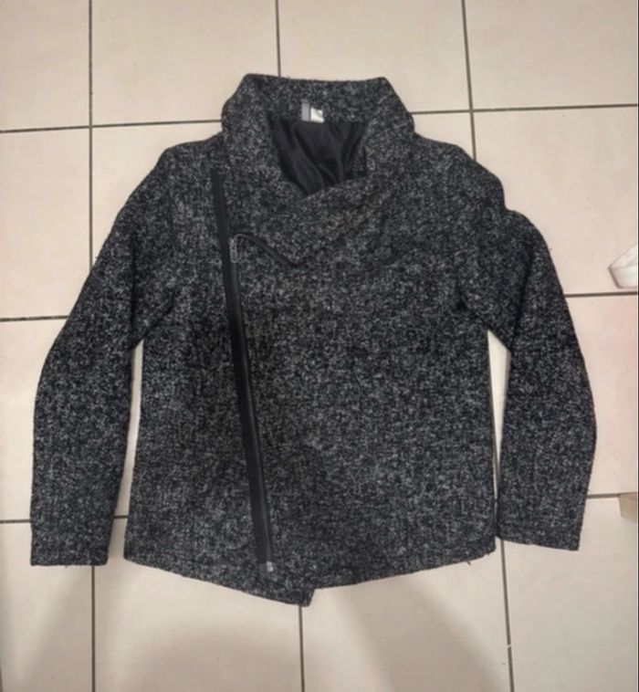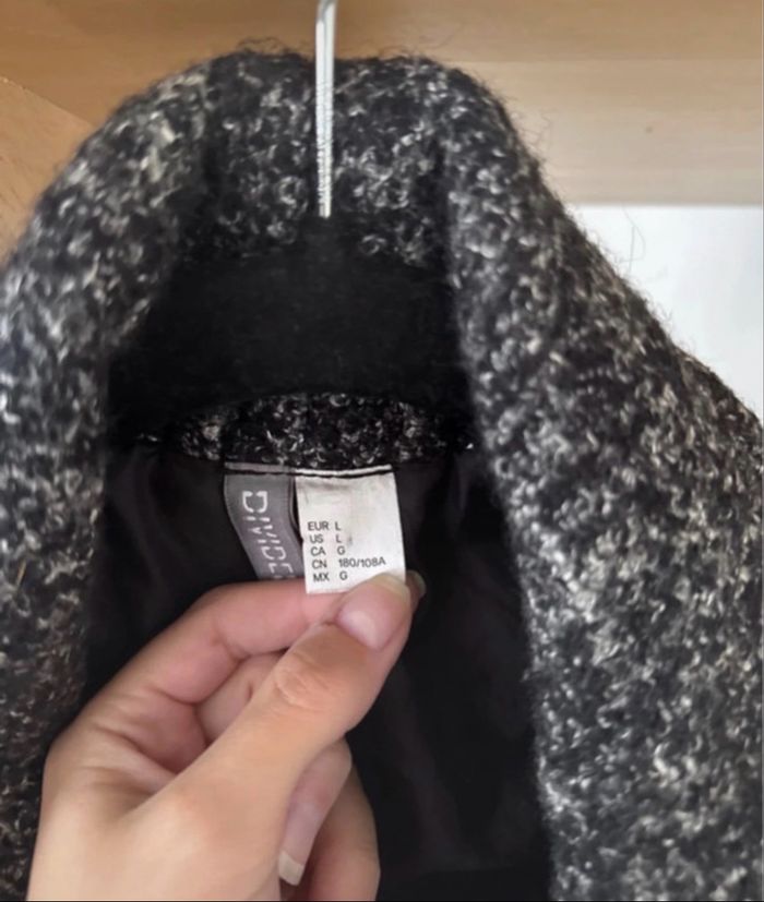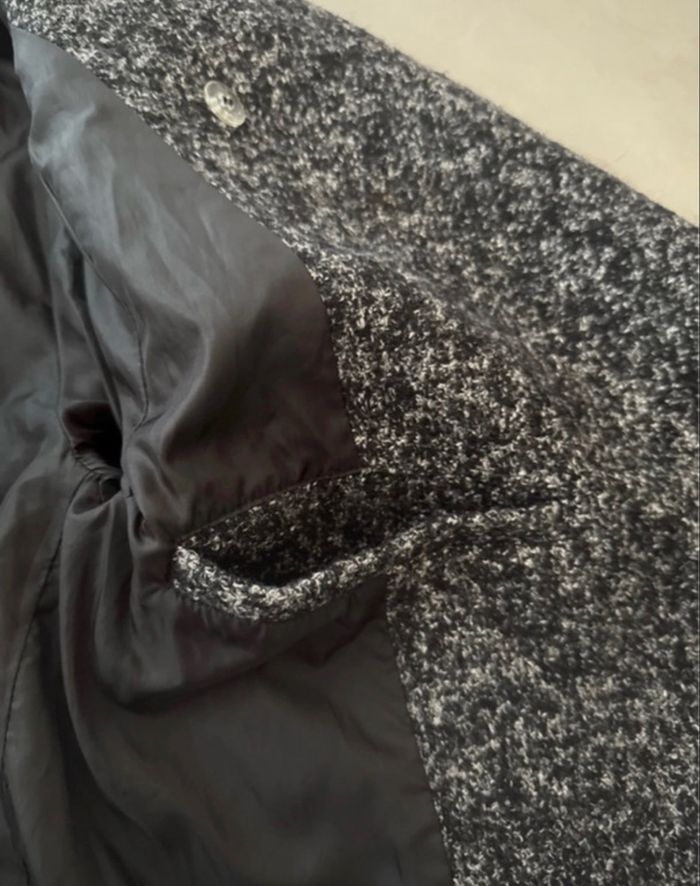Porté mais en très bon état général. Bouton de rechange, poche intérieur, mélange de laine, polyester et viscose.