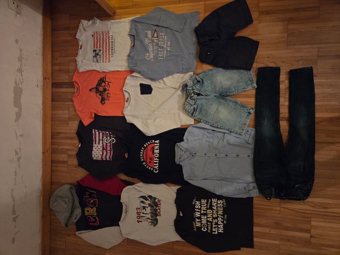 Vends lot de vêtements tape a l'œil Tape 6 ans - 116 cm - Deux sweats dont un avec capuche Prix 9 euros à l'unité - Deux tee shorts Prix 6 euros l'unité - Cinq polos Prix 8 euros l'unité - Une chemise à boutons Prix 5 euros l'unité - Deux shorts - toile - jeans Prix 6 euros l'unité - Un jeans - régular - des accros d'origine Prix 8 euros l'unité Prix 20 euros le lot
