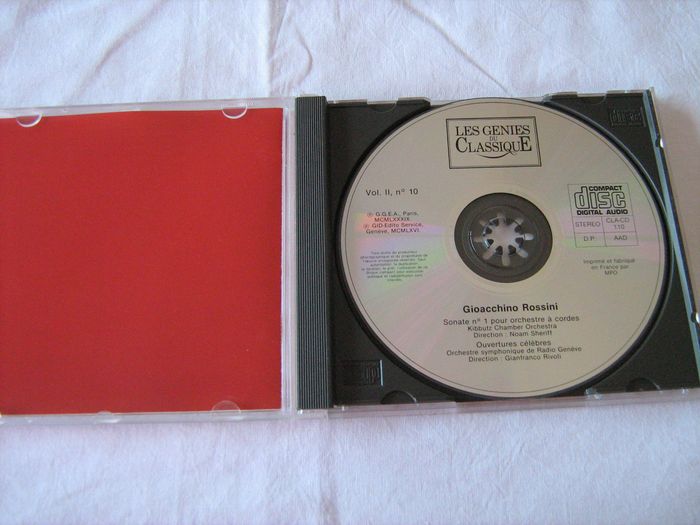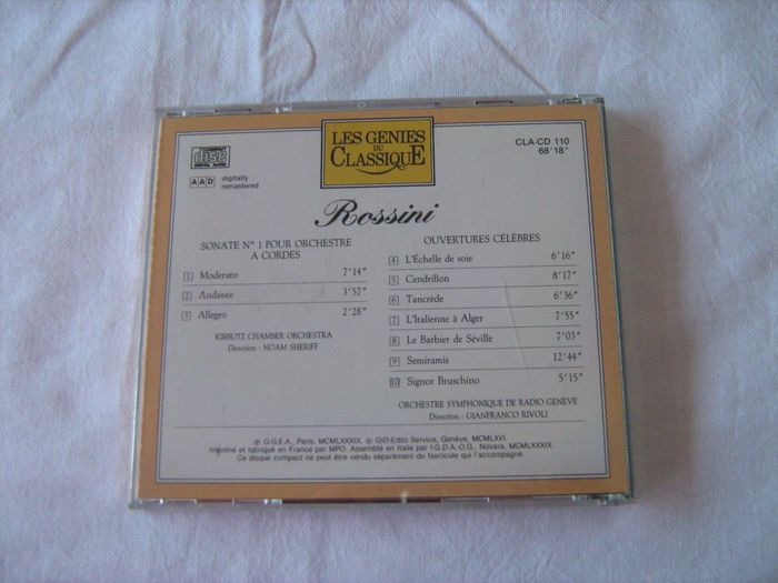 Vends CD Les génies du classique - Rossini - Sonate n°1 pour orchestres à cordes et ouvertures célèbres. Sonate n° 1 pour orchestre à cordes : 1/ Moderato 2/ Andante 3/ Allegro Ouvertures célèbres : 4/ L'Echelle de soie 5/ Cendrillon 6/ Tancrède 7/ L'Italienne à Alger 8/ Le Barbier de Séville 9/ Sémiramis 10/ Signor Bruschino Pour plus de choix, allez voir mes autres annonces.
