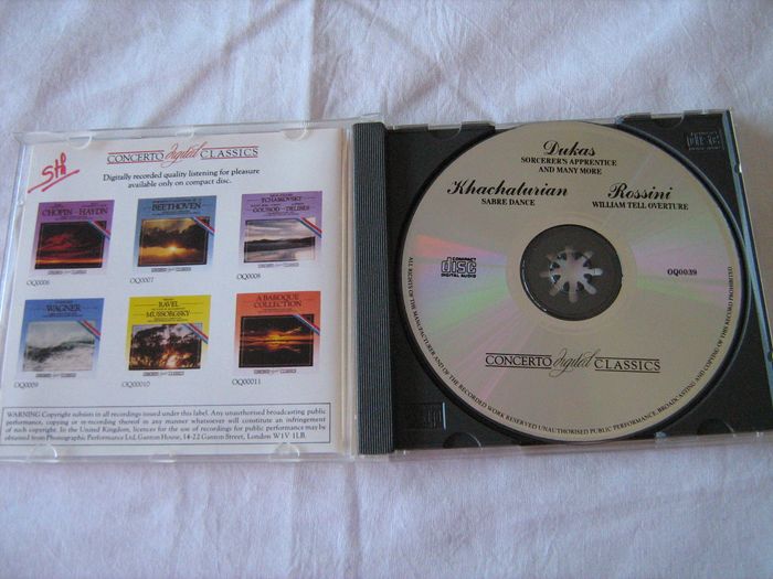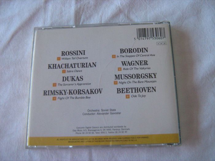 Vends CD Rossini, Khachaturian et Dukas. ROSSINI : 1/ William Tell ouverture KHACHATURIAN : 2/ Sabre Dance DUKAS 3/ The Sorcerer's Apprentice RIMSKY-KORSAKOV : 4/ Flight of The Bumble Bee BORODIN : 5/ In The Steppes Of Central Asia WAGNER : 6/ Ride Of The Valkyries MUSSORGSKY : 7/ Night Of The Bare Mountain BEETHOVEN : 8/ Ode To Joy Pour plus de choix, allez voir mes autres annonces.