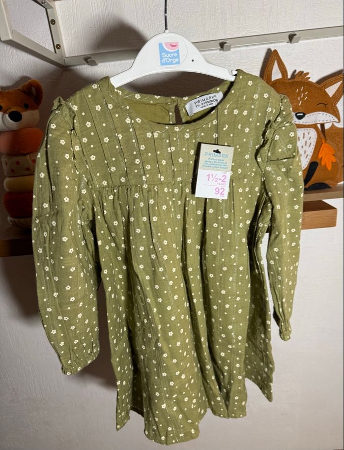 Jolie robe primark, couleur vert olive à motif fleurie 🌸. Idéal pour le printemps et les beaux jours Taille 1,5 / 2 ans - 92cm Neuf avec étiquette