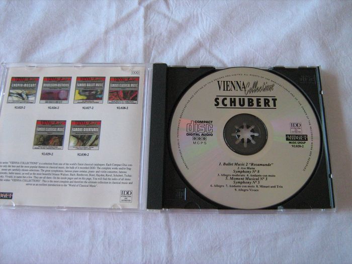 Vends CD Vienna Collections - Schubert - Rosamunde, Ave Maria, Symphonie N° 5, Symphonie n° 8 "Unfinished". 1/ Ballet Music 2 - Rosamunde 2/ Ave Maria Symphonie n° 8 "Unfinished" : 3/ Allegro moderato 4/ Andante con moto 5/ Moment Musical n° 3 Symphonie n° 5 : 6/ Allegro 7/ Andante con moto 8/ Minuet and Trio 9/ Allegro Vivace Pour plus de choix, allez voir mes autres annonces.