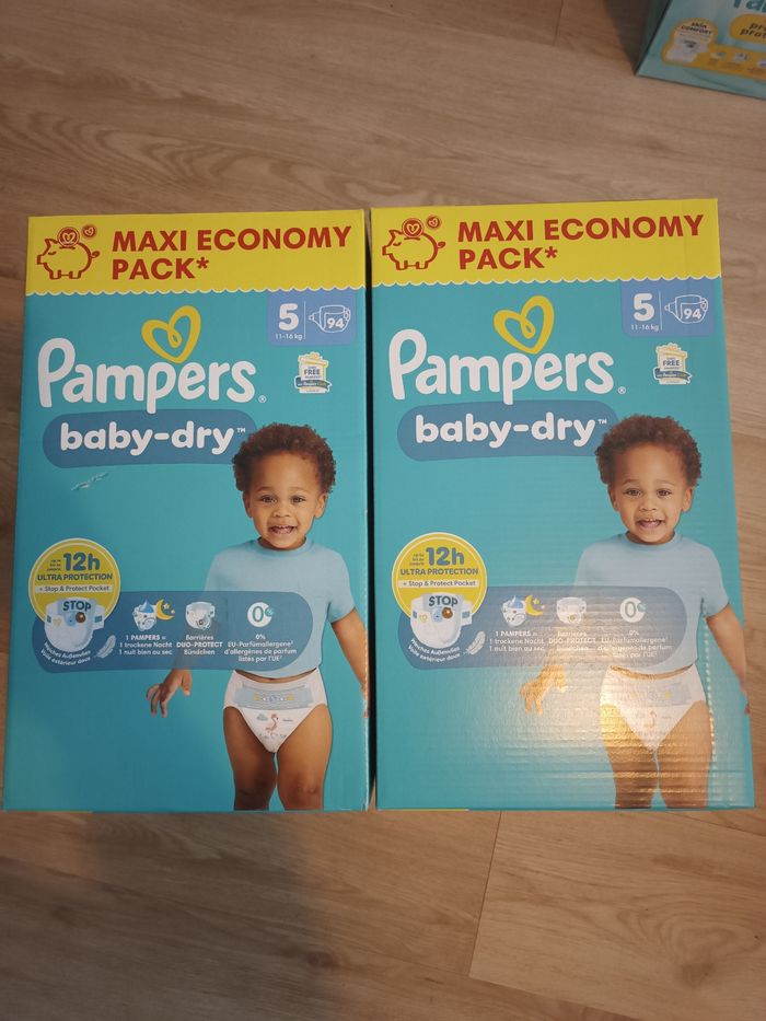 Bonjour Je vends un lots de 2 cartons neuf Pampers baby-dry taille 5 188 couches au total Envoie rapide