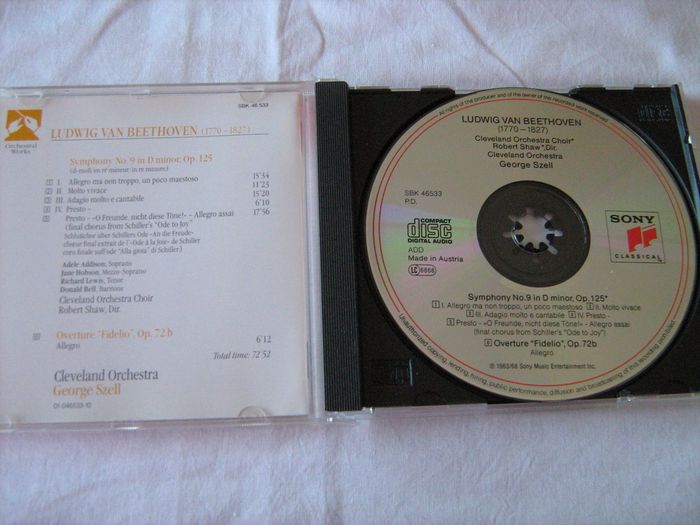 Vends CD Essential Classics - Beethoven - Symphonie n° 9 et "Fidelio" ouverture. Symphonie n° 9 op. 125 : 1/ I. Allegro ma non troppo, un poco maestoso 2/ II. Molto vivace 3/ III. Adagio molto e cantabile 4/ IV. Presto 5/ Presto Ouverture "Fidelio" op 72 : 6/ Allegro Pour plus de choix, allez voir mes autres annonces.