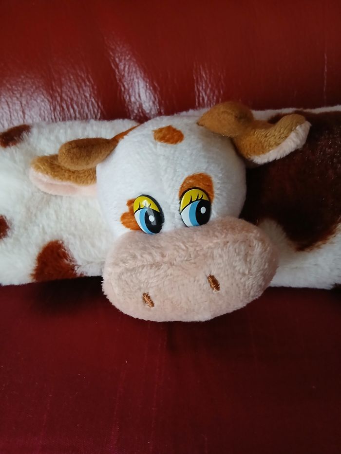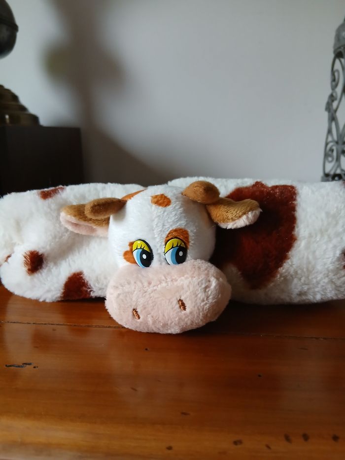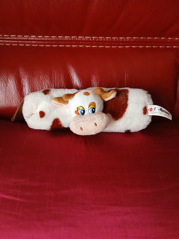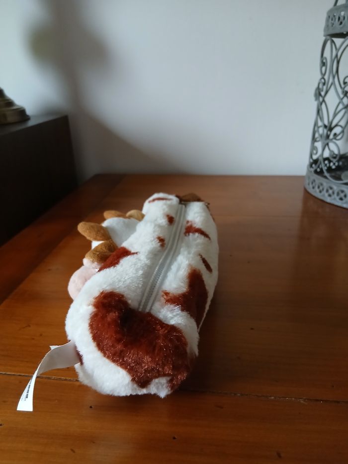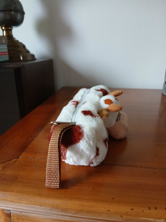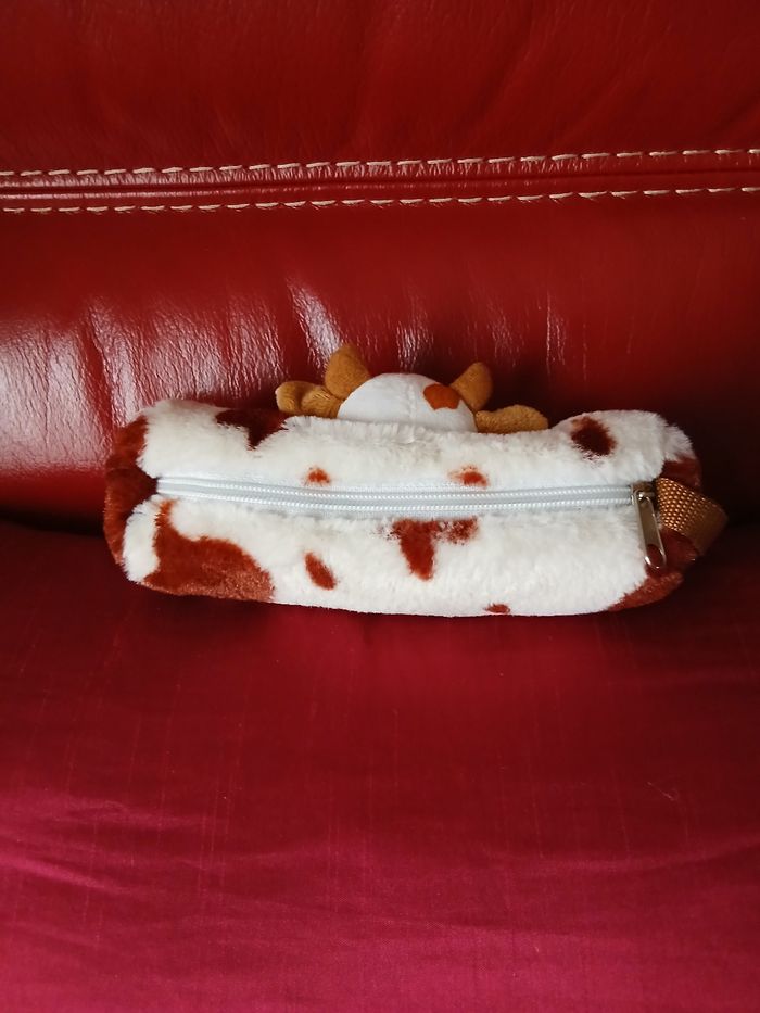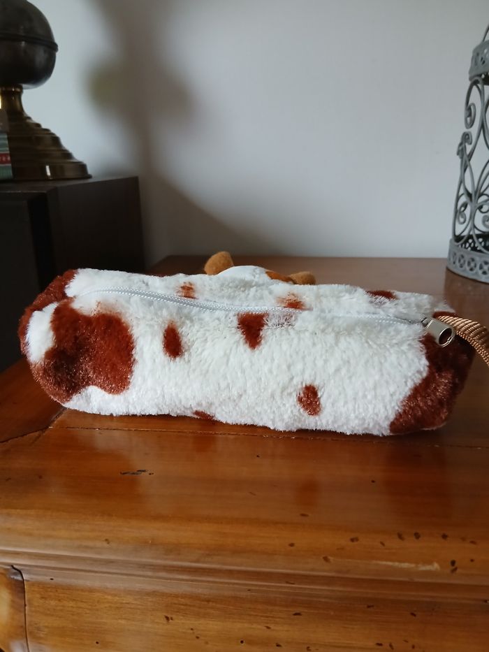 Trousse souple "Petite Vache 🐄" avec tête rembourrée; yeux en plastique; tissu peluche coloris blanc cassé et tâches marron. Trousse zippée; queue de la Vache en ruban renforcé. Longueur 20 cm; hauteur 6 cm. Lavableà30° // voir photos pour détails