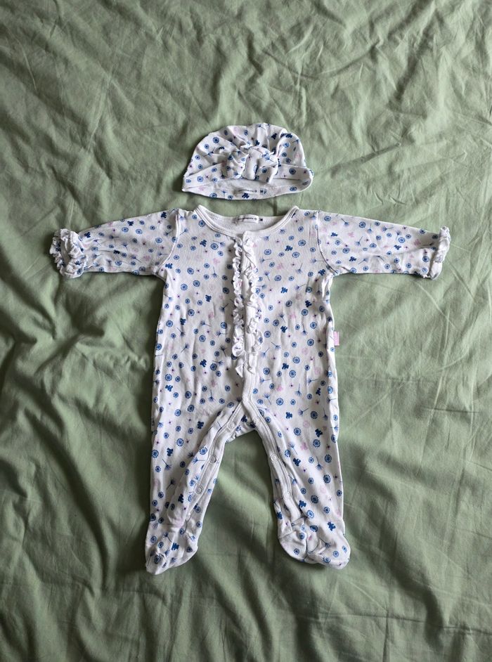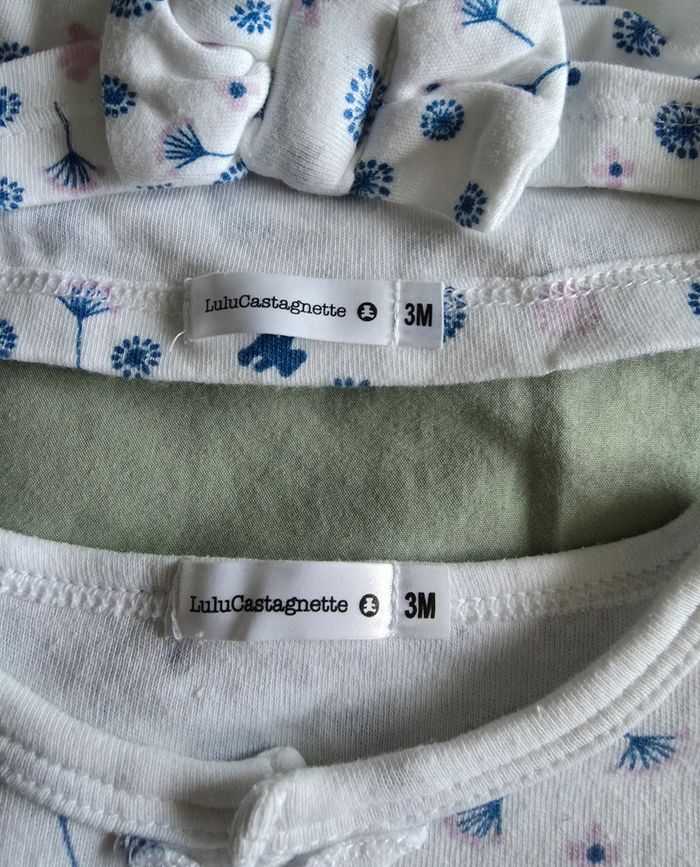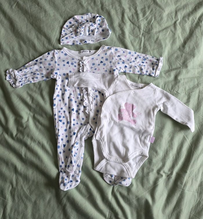 ​✨ ÉTAT : Très bon état global. Les pièces sont impeccables, le blanc est bien éclatant et les motifs (fleurs et ourson "Lulu Rock") sont intacts. ​📏 TAILLE & COUPE : 3 mois (60 cm). Le lot comprend : ​Un pyjama à pieds avec volants et son bonnet turban assorti. ​Un body forme cache-cœur (croisé), ultra pratique pour le change. ​🌿 MATIÈRE : 100% Coton. Tissus souples, doux et respirants, parfaits pour la peau sensible de bébé. ​📦 LIVRAISON : Envoi via Mondial Relay (lockers), Shop2Shop, ou Chronopost (point relais physique). ​🎁 Réductions sur les lots activées ! Profitez-en pour grouper vos achats et optimiser les frais de port.