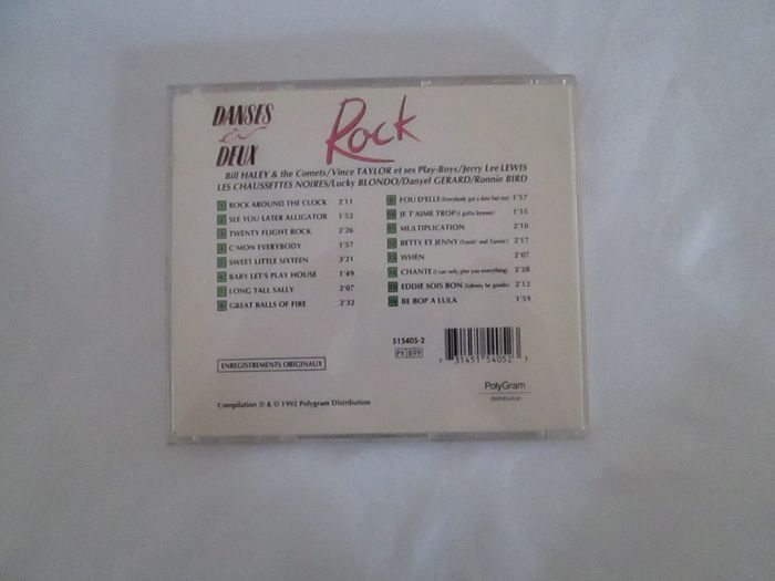 Vends CD Danses à deux - Rock. 1/ Rock around the clock 2/ See you later alligator 3/ Twenty flight rock 4/ C'mon everybody 5/ Sweet little sixteen 6/ Baby let's play house 7/ Long tall Sally 8/ Great balls of fire 9/ Fou d'elle (Everybody got a date but me) 10/ Je t'aime trop (I gotta knaw) 11/ Multiplication 12/ Betty et Jenny (Tossin' and Turnin') 13/ When 14/ Chante (I can only give you everything) 15/ Eddie sois bon (Johnny be good) 16 Be bop a lula Pour plus de choix, allez voir mes autres annonces.