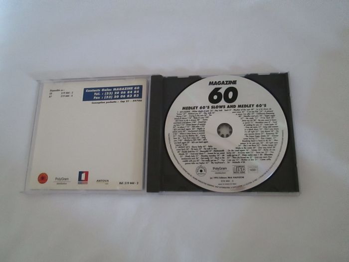 Vends CD Magazine 60 - Medley 60's slows and Medley 60's. MEDLEY 60'S SLOWS - Whiter shade of pale - Hey Jude - Without you - Honey - Crying in the rain - The sound of silence - Baby it's you - All I have to do is dream - Trains and boats and planes - Good bye my love - Green leaves of summer - La playa - 500 miles - 60's are back again - Nights in white satin - Unchained melody - When a man loves a woman - You are my destiny - True love ways - Only you - Bluberry hill MEDLEY 60'S - Sherry baby - Baby come back - 96 tears - No milk to day - Double dutch bus - Douwadidi - Mademoiselle Ninette - Twist and shout - Sweets for me sweet - Shady lady - Monday monday - Mr tambourine man - Get ready - Stuck in the middle with you - You really got me - You donna take me higher - My boyfrien's back - Rhythm of the rain - Le p'tit clown de mon coeur - C'est ma fête - A présent tu peux t'en aller - California dreaming - Needles and pins - Sugar sugar - No reply - I'll be back - Drive my car - Do you want to know a secret - Nowhere man - Tired of waiting of you - Louie Louie - Give me more - Long cold woman in a black dress - Do you know it's all right - Lets dance - Do you wanna dance - Runaway - The hippy hippy shake - Gimme me some loving - Day tripper - Breaking heart is hard to do - Mon amour tu ne sais pas - All right now - She's not there - Guitar tango - Wade in the water - One way ticket - On the road again - Telstar - Biche oh ma biche - Arizona man - Save me - You really got me - Water melon man - Silhouettes - Then she kissed me - Love you more than I can say - Mother in law - Come softly - Rubitello. Pour plus de choix, allez voir mes autres annonces.