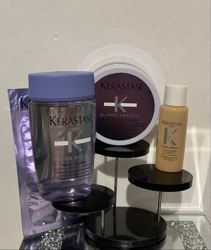 KERASTASE•lot. GLOSS ABSOLU 🥀 oil de rose 15ml neuf jamais ouvert, BLOND ABSOLU 🫐 crème shampooing75ml neuf jamais servi shampooing 75ml, sérum nuit 10ml.