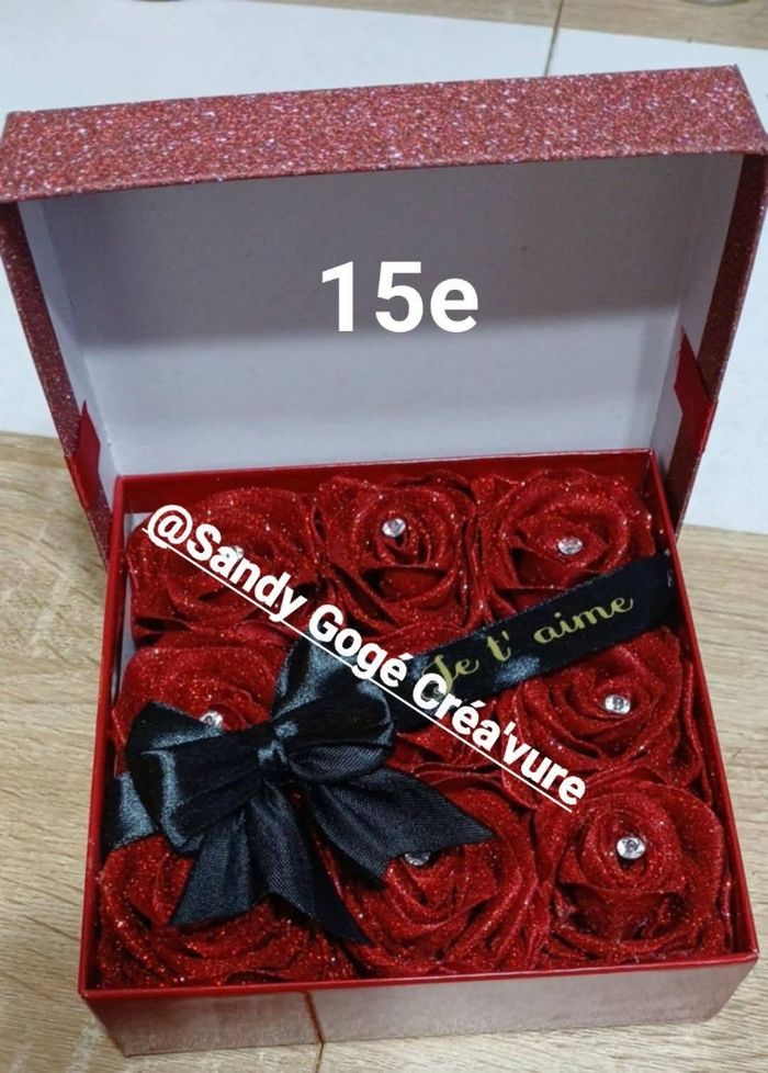 Coffret avec 9 roses éternelle pailletées et nœud avec ruban écrit Je t'aime.