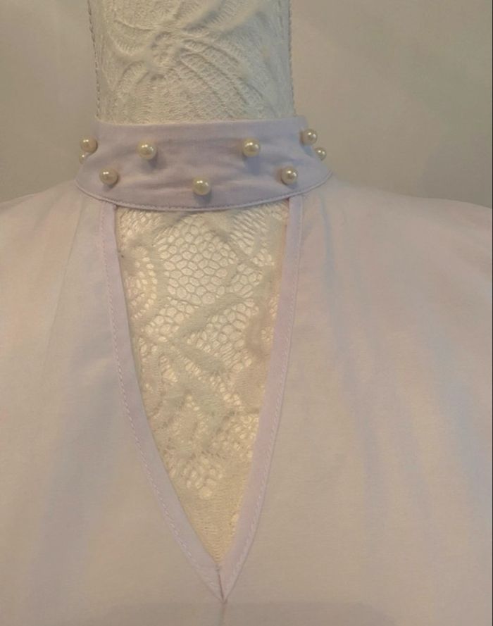 ✅ Blouse avec col montant perlé : Elle possède un col officier orné de petites perles blanches délicates, apportant une touche de sophistication. ✅ Les manches sont entièrement froncées sur toute la longueur du bras, créant un volume texturé et un aspect "bouffant" moderne. 📐Taille 34 🎨 Couleur : blanche 👍Bouton de rechange/ secours 🧵 Matière : 63% coton + 37 % Polyester Même model dispo en bleu en 36