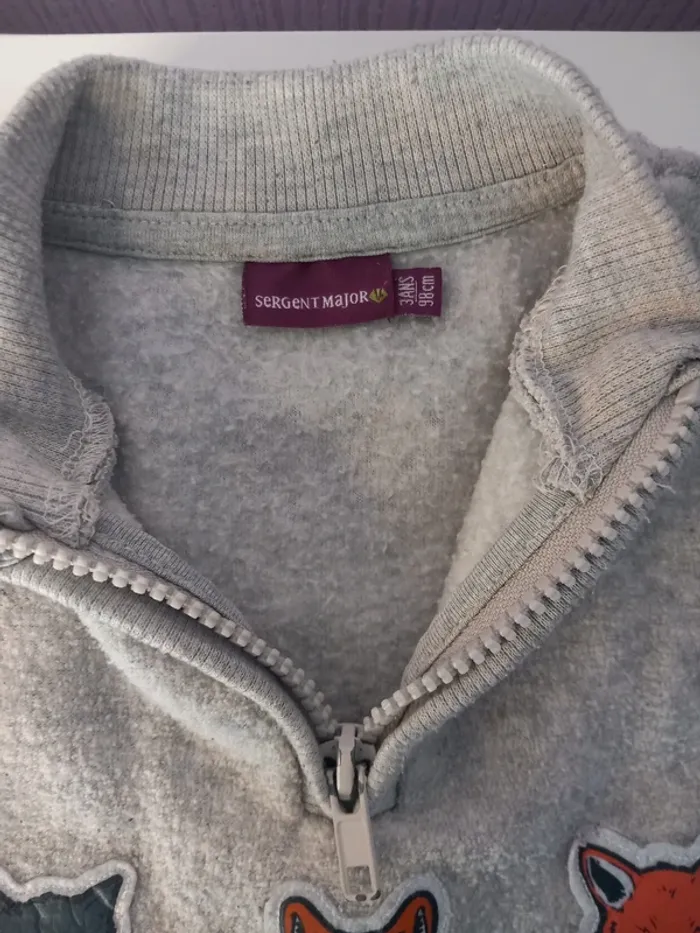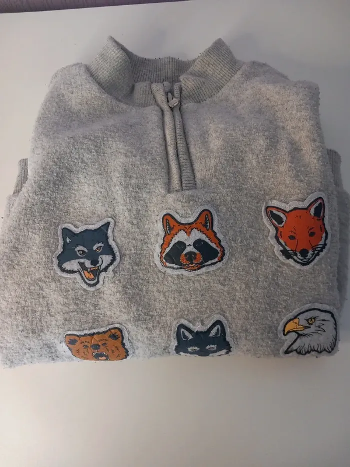 🦊 Pull chaud et tout doux de la marque Sergent Major 100% polyester. 🦊 Décoré avec des têtes d'animaux de la forêt 🦊 Gris clair avec une petite fermeture éclair au niveau du cou 🦊 Bon état, un peu pelucheux par endroit