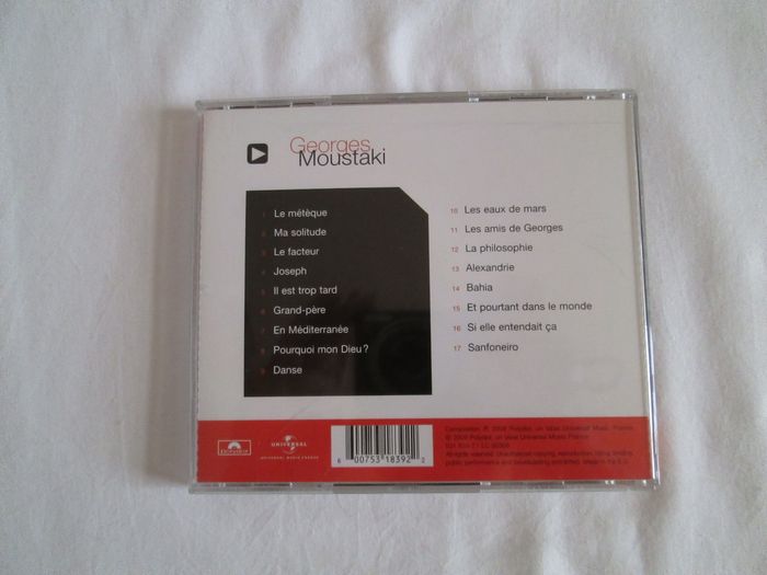 Vends CD Georges Moustaki. 1 / Le Métèque 2 / Ma solitude 3 / Le facteur 4 / Joseph 5 / Il est trop tard 6 / Grand-père 7 / En Méditerranée 8 / Pourquoi mon Dieu ? 9 / Danse 10/ Les eaux de mars 11/ Les amis de Georges 12/ Ma philosophie 13/ Alexandrie 14/ Bahia 15/ Et pourtant dans le monde 16/ Si elle entendait ça 17/ Sanfoneiro Pour plus de choix, allez voir mes autres annonces.