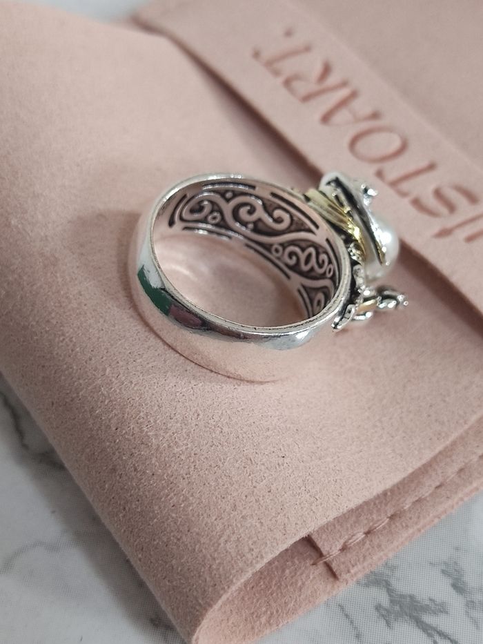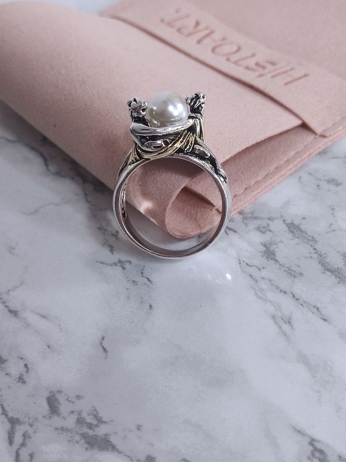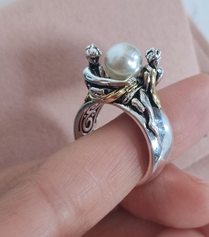 Bague originale représentant deux femmes allongées et entourant une perle au centre ! 😍 Un bijou fort en symbolique (amour, union, protection) avec une très belle présence au doigt. ✔️ Finition argentée avec touches dorées de la tige drapant les femmes ✔️ Travail de détails visible sur les côtés ✔️ Perle lumineuse et bien mise en valeur Taille 7 / 17.3mm diamètre intérieur État : Neuve, jamais portée. Vendue avec son pochon 🎁👜🛍️ #bagueargentée #baguefemme17 #bagueromantique #bagueromaine #ring #romanticring #bagueoriginale