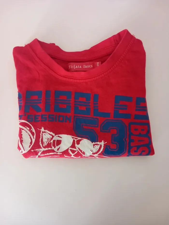 🏀 Tee shirt en taille 3 ans de la marque Tissaia. 🏀 Rouge avec un chat blanc qui joue au basket et diverses inscriptions en bleu. 🏀 très bon état