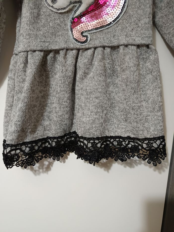 Jolie petite robe grise motif licorne avec sequins, Bas de la robe avec de la dentelle, EXCELLENT état, peu portée ! Taille 12 mois