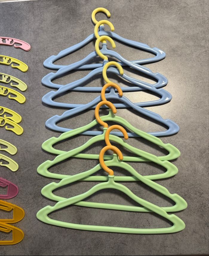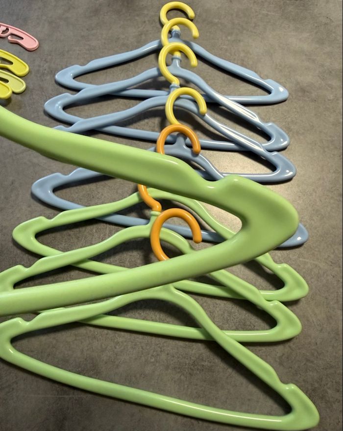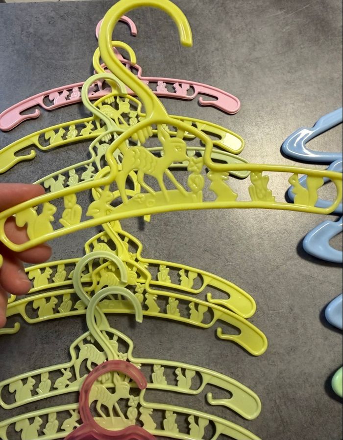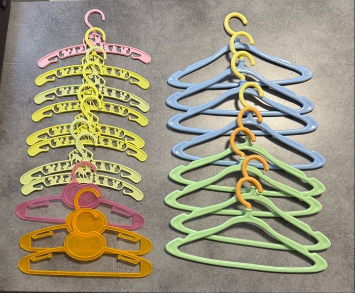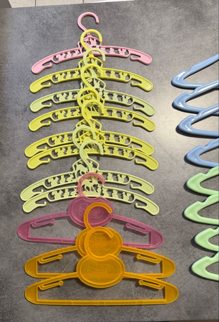 Vend ce lot de 19 cintres pour enfants 3 modèles différents Ceux de gauche sont un peu plus petits donc plus pour bébé Utilises quelques temps mais restent en très bon état