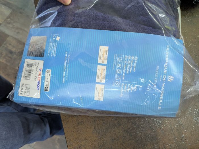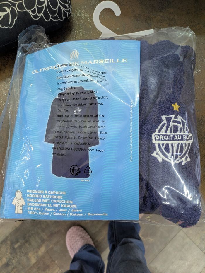 Peignoir de bain olympique de Marseille neuf dans l'emballage. Juste l'emballage est abîmé. Taille 6-8 ans. Prix neuf 39,90