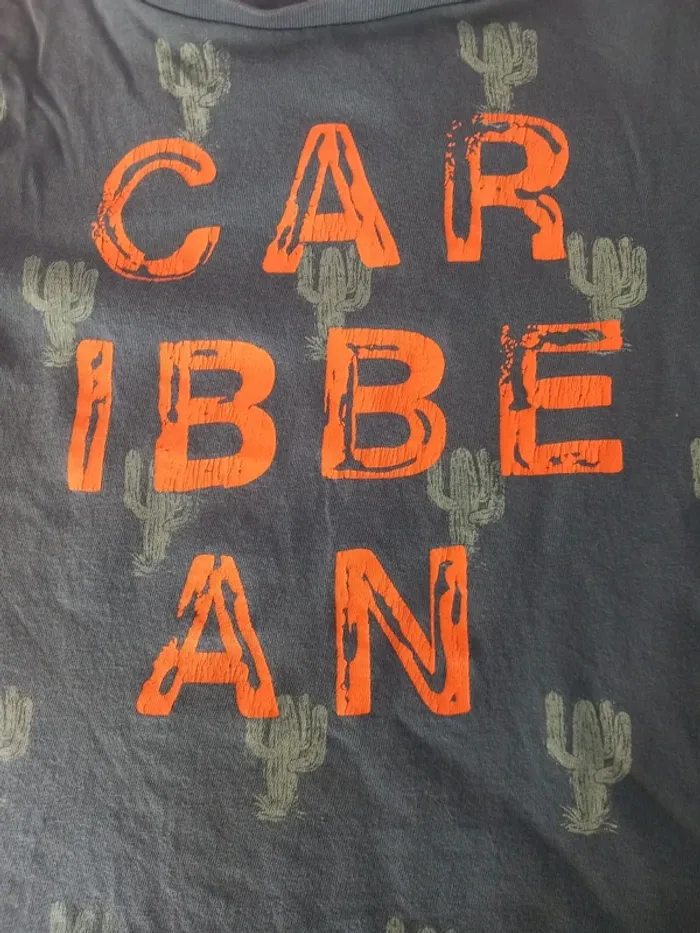 🌵 tee shirt en taille 3 ans de la marque Kiabi. 🌵 bleu avec des cactus bleu plus clairs. 🌵 inscription en lettres capitales oranges Caribbean. 🌵 très bon état