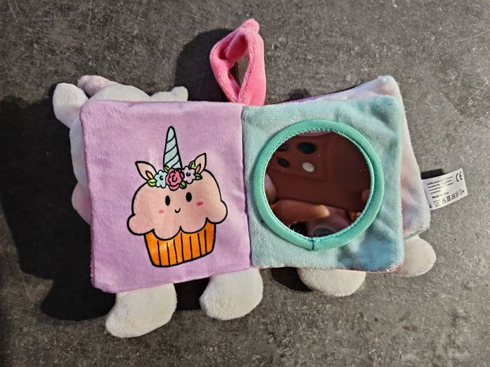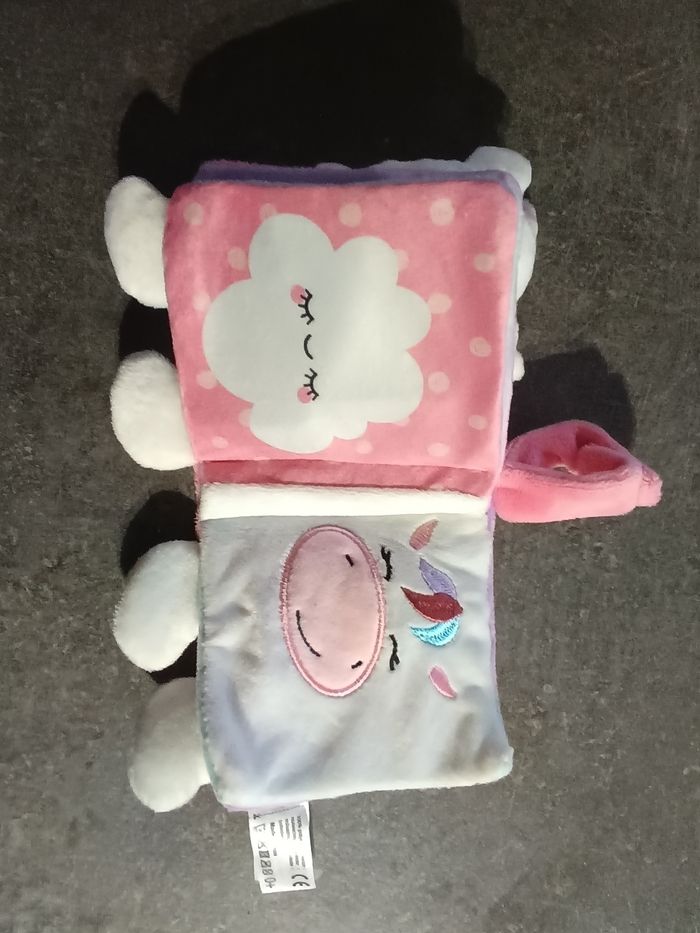Livre sensoriel en tissu licorne Avec différentes matières à toucher et sons, Avec un miroir (quelques rayures) et un poulet pouet. Peu s'attacher au cosy et à la poussette. Très bon état