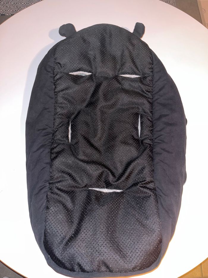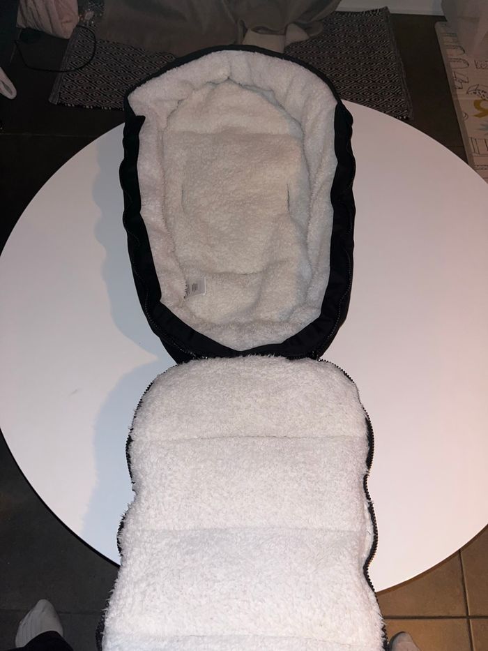 Fermeture éclair de chaque côté. Tien très chaud pour l’hiver grâce à une doublure en peluche. Convient de la naissance à 9 mois environ. Il y a les ouvertures derrière pour passer les sangles. Fait pour coque et nacelle. Très propre, n’a pas de défauts, maison non fumeur.