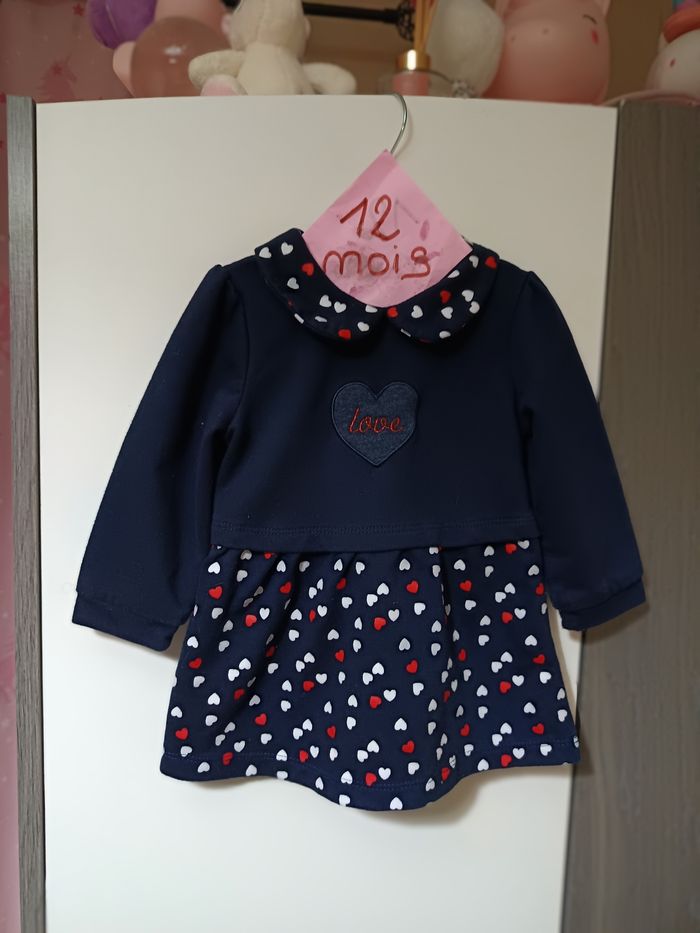 Robe sweat bleue marine avec col claudine et petits coeurs blancs et rouges, Comme NEUVE, portée 1 ou 2 fois ! Taille 12 mois