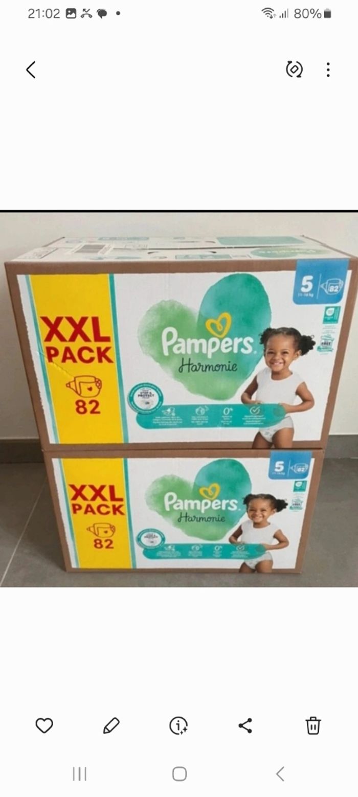 Deux cartons XXL COUCHES pampers harmonie neuves. Taille 5 82×2 11/16kg Envoie très bien soigné et rapide.