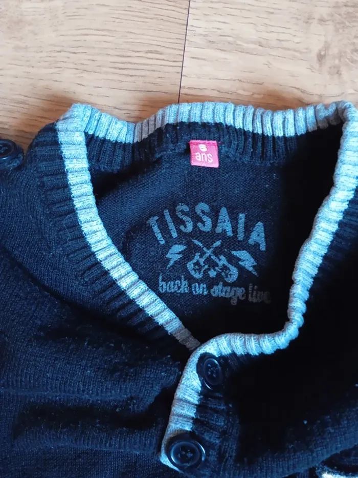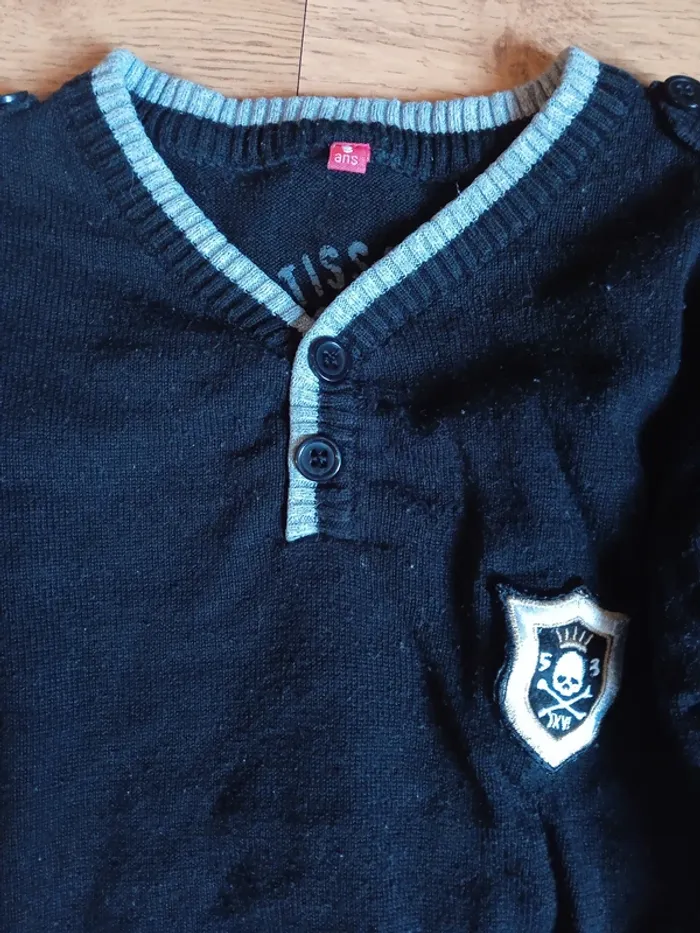 😎 pull léger de la marque Tissaia collection Back on stage live. 😎 taille 5 ans. 😎 50% coton et 50% acrylique 😎 noir avec un badge crâne sur le torse. 😎 petits détails gris sur le col et les coudes. 😎 très bon état