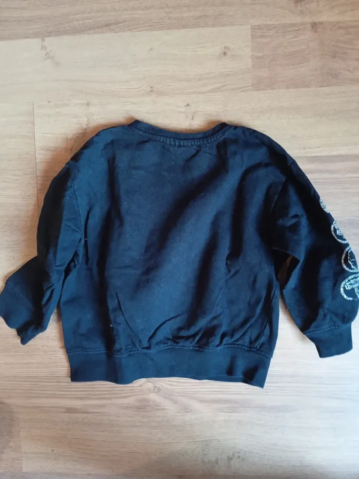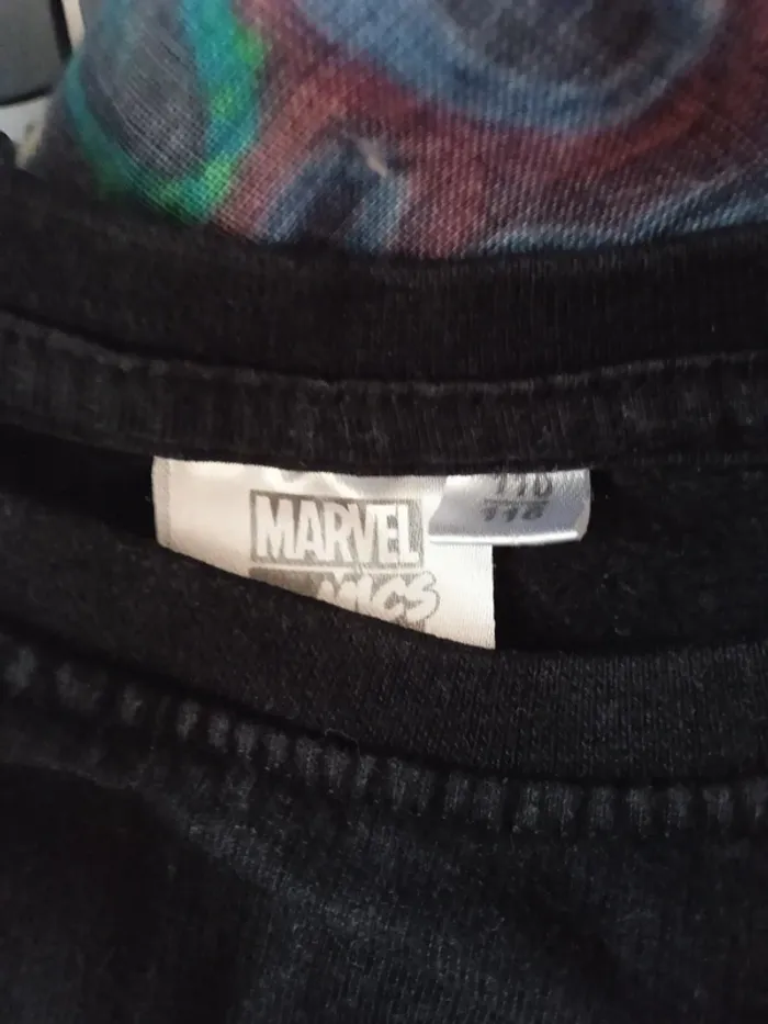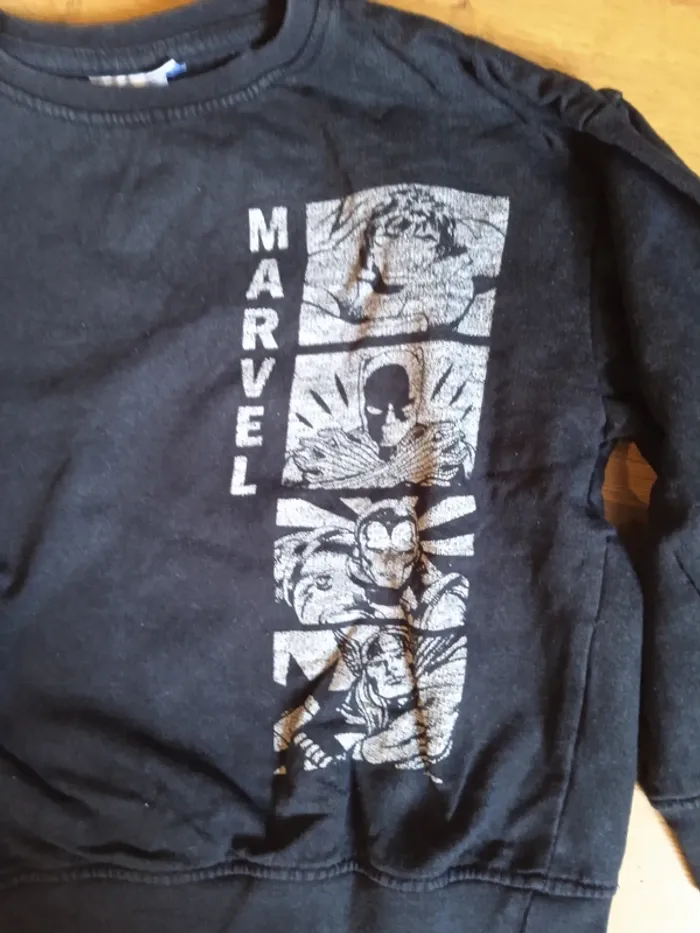 😃 sweat noir Marvel en taille 110 116. 😃 Il y a sur le torse et une manche des illustrations des héros Marvel. 😃 100% coton. 😃 délavé mais reste en bon état
