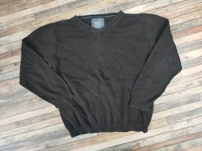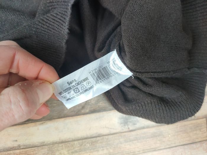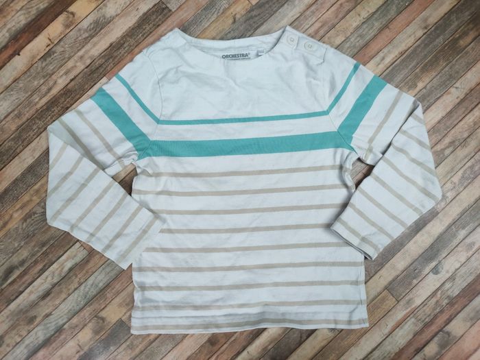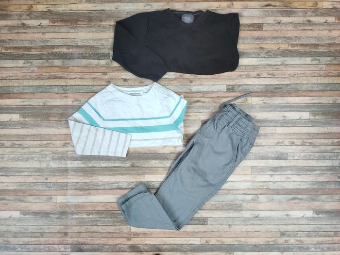 Marinière Orchestra, pantalon gris In Extenso en parfait état. Taille élastique. J'ajoute un pull col V léger et chaud en laine/cachemire pour compléter le look. Taille 5 ans.