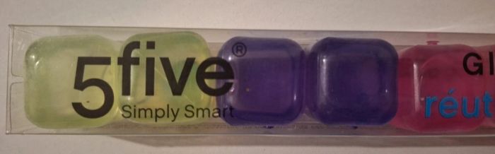 Boîte de dix glaçons réutilisables de cinq couleurs différentes. Côtés de 2,5 cm.