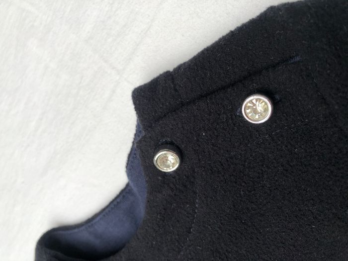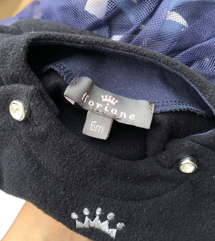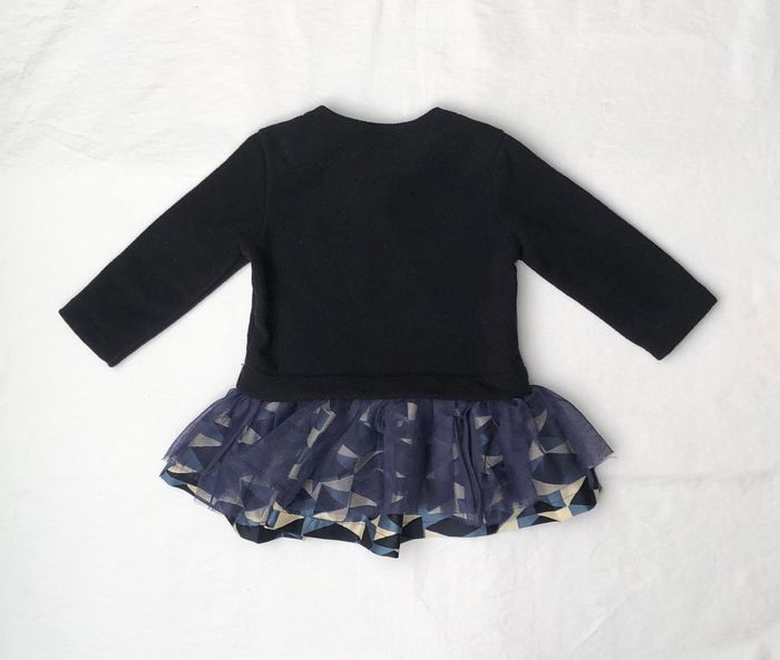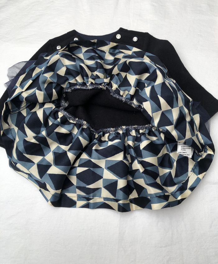 Robe courte Floriane, Taille 6 mois, Hiver, Manches longues. Jolie et originale robe bi-matière, le haut est en polaire bleu marine toute douce, et le bas est composé d’un jupon en tissu fluide, à motifs géométriques crème, bleus et noirs, et de 2 volants en tulle par-dessus. Ouverture au niveau de l’encolure avec des boutons strass des deux côtés. En excellent état, pas de signe d’utilisation. 🌸 Vous aimez cet article ? N’oubliez pas de visiter le reste de mon dressing en filtrant les tailles.