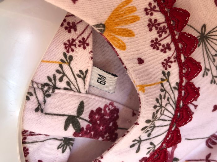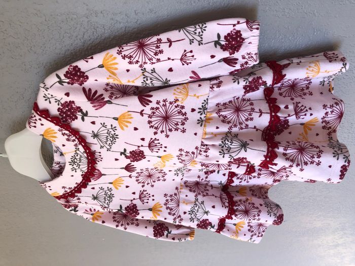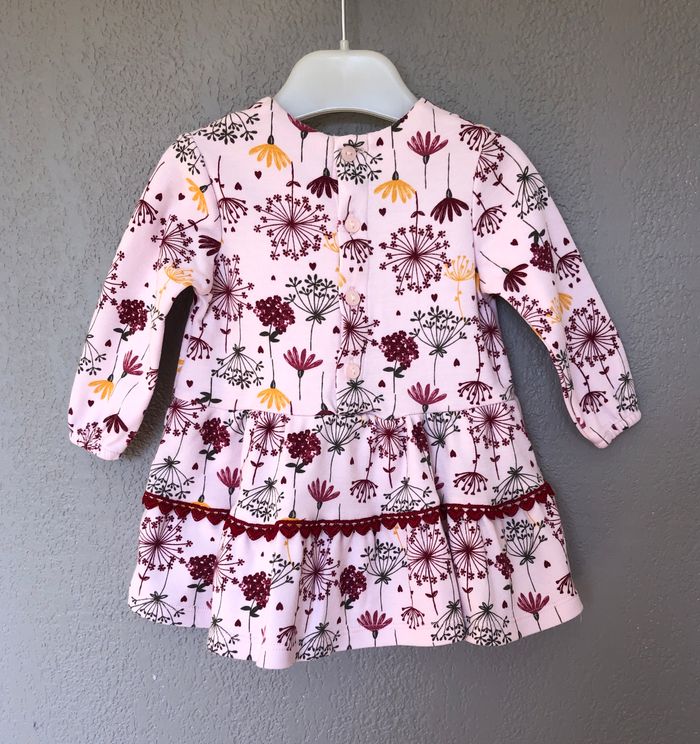 Très jolie robe Plus Collection, Taille 6 mois, Mi-saison, Manches longues. Fond rose pâle avec un imprimé original de fleurs/ombellifères dans les tons gris, bordeaux, moutarde. Biais de cœurs qui contourne le col et la jupe. Ouverture par bouton dans le dos. En très bon état, sans trou, ni tache. 🌸 Vous aimez cet article ? N’oubliez pas de visiter le reste de mon dressing en filtrant les tailles.