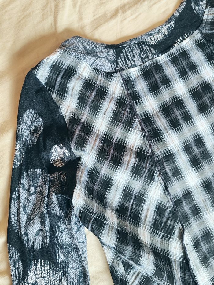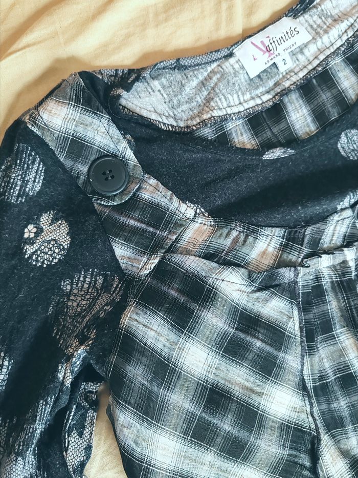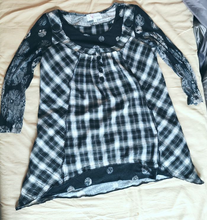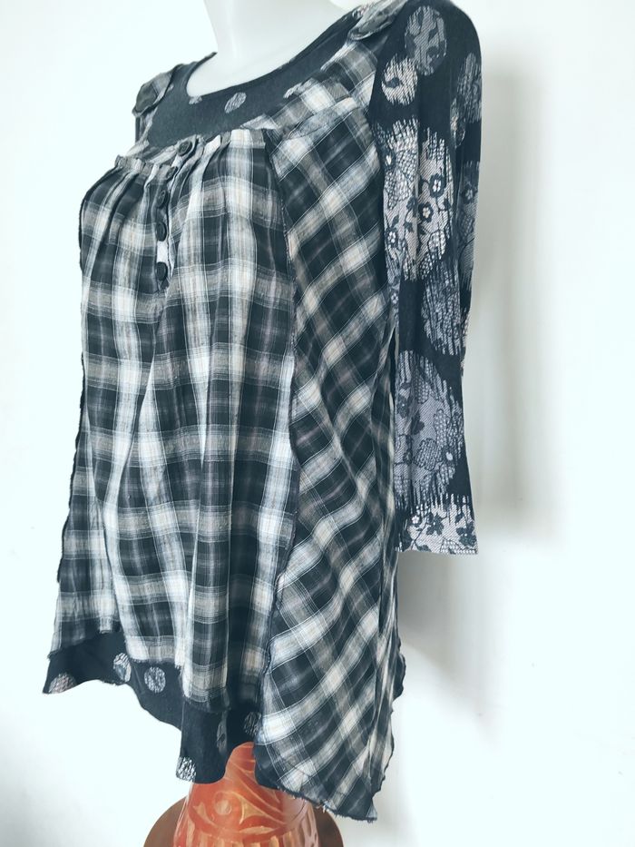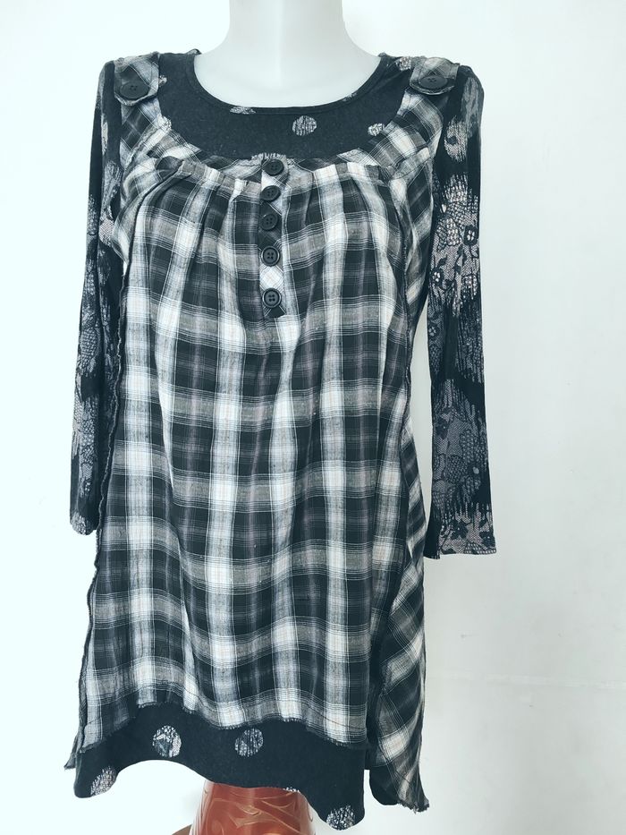 Très bon état Mesure à plat épaule 36, longueur dos 68, largeur sous aisselles 50 Jolie tunique, idéale pour un look à la fois original, confortable et stylé. ✨ Détails : Couleurs : noir, gris et blanc Mélange de motifs : carreaux à l’avant + manches imprimées effet dentelle / floral Encolure arrondie avec boutons décoratifs Coupe ample et fluide, parfaite pour les silhouettes généreuses Manches longues Matière agréable à porter au quotidien 👗 Se porte facilement avec un legging, un jean ou un pantalon noir. Parfaite pour un style casual chic, bohème ou urbain.