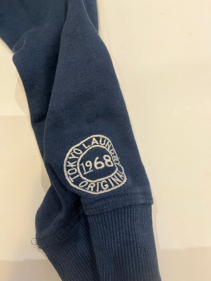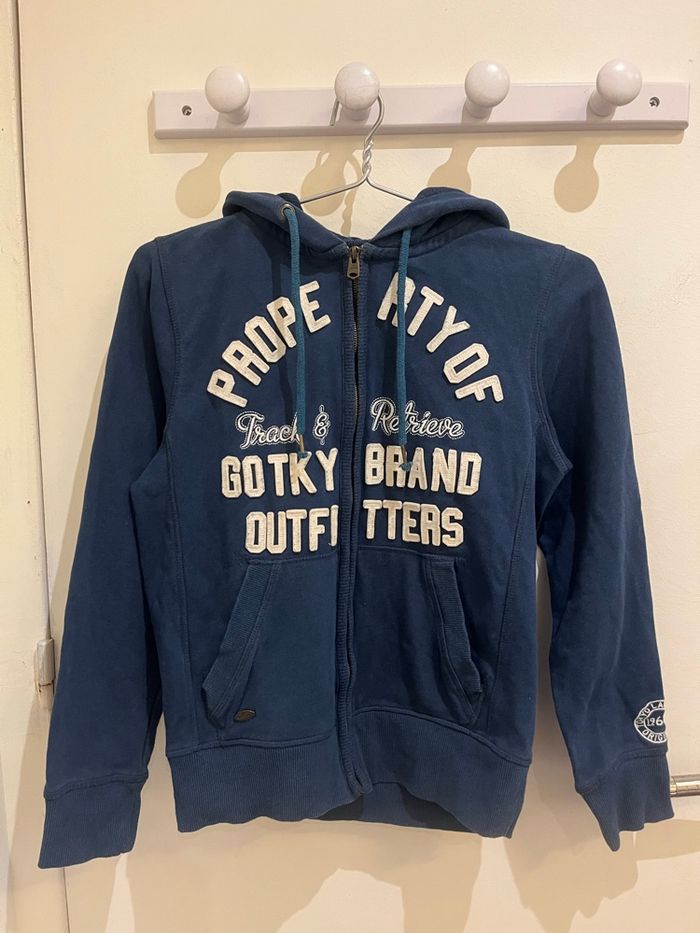 • Sweat à capuche bleu fermeture zippée. Cordon pour resserrer la capuche et poches à l’avant. Inscription à l’avant et broderie sur la manche. En coton et polyester • taille S, marque tokyo laundry vintage mesures: 37 cm entre les épaules, 47 cm entre les aisselles, 57 cm de longueur • tout petit défaut voir la dernière photo sinon en très bon état
