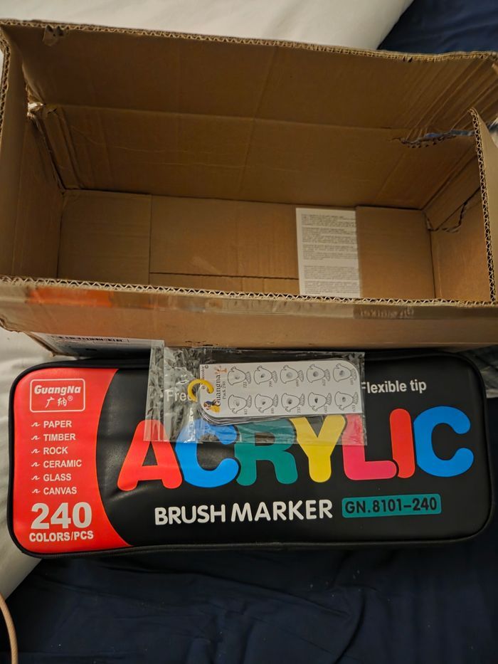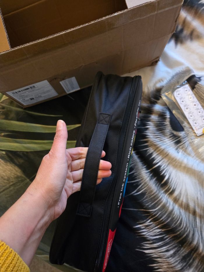 Pratique dans sa trousse livrer dans son emballage d'origine avec sa bandouliere Fournit avec ́nuancier Ouvert juste pour la photo jms servis Mine de rechange fournit Envois le jour memes ou lendemain
