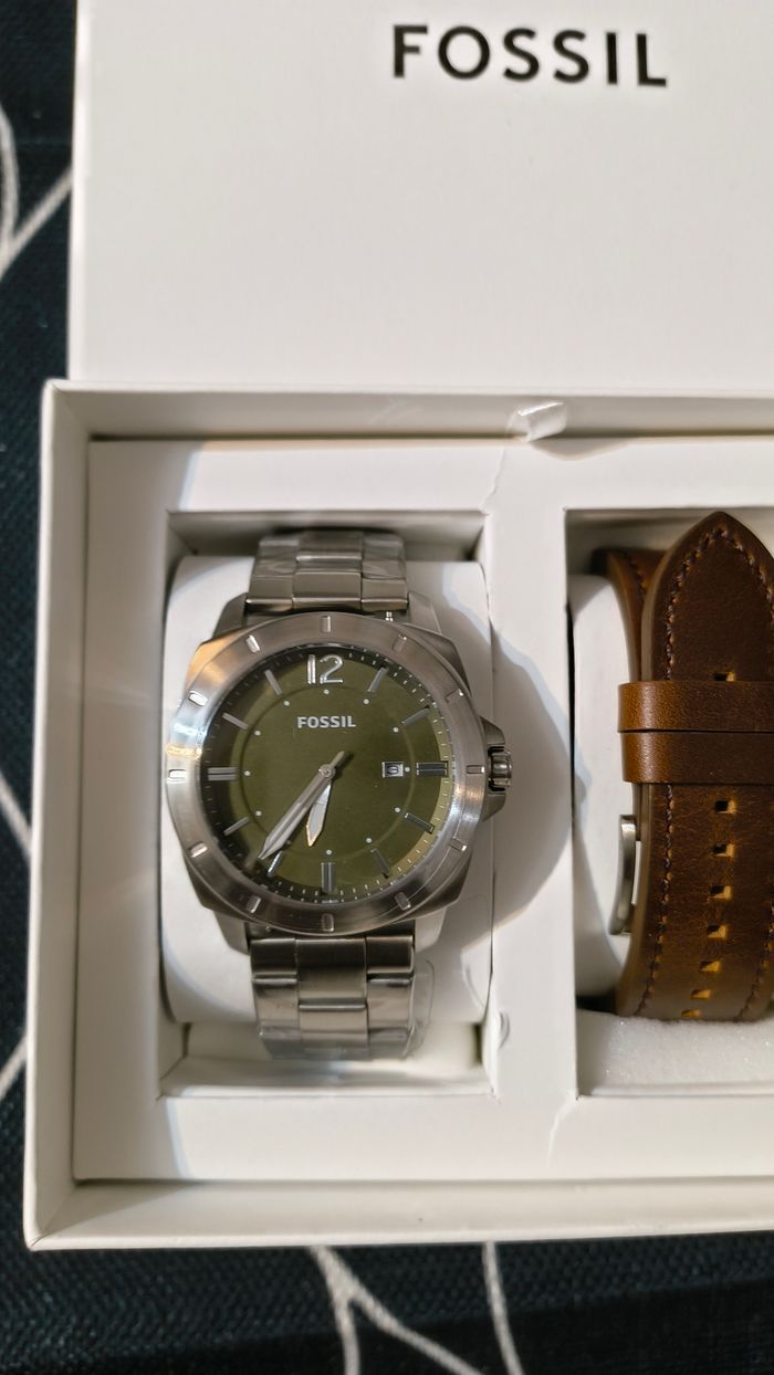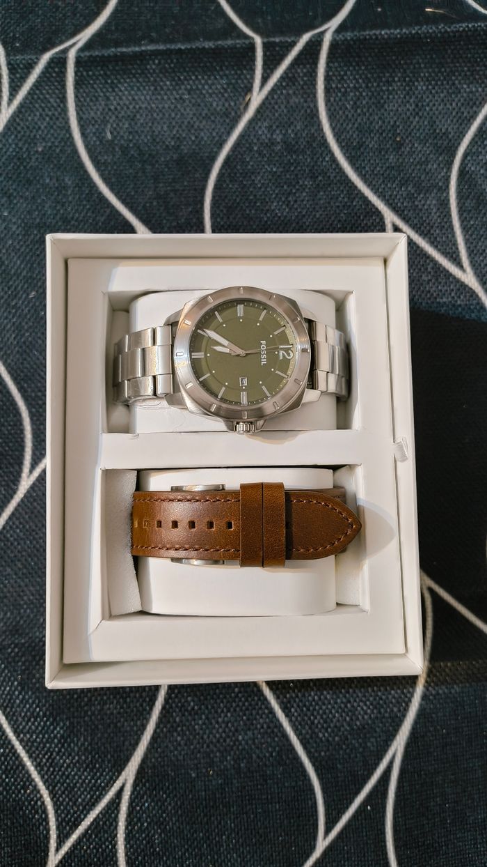 Coffret montre Fossil avec bracelet de rechange en cuir neuf avec étiquette. Son prix d'achat marqué sur l'étiquette. Cadran vert, largeur de la bande 24mm. Je la revend car j'ai une urgence.