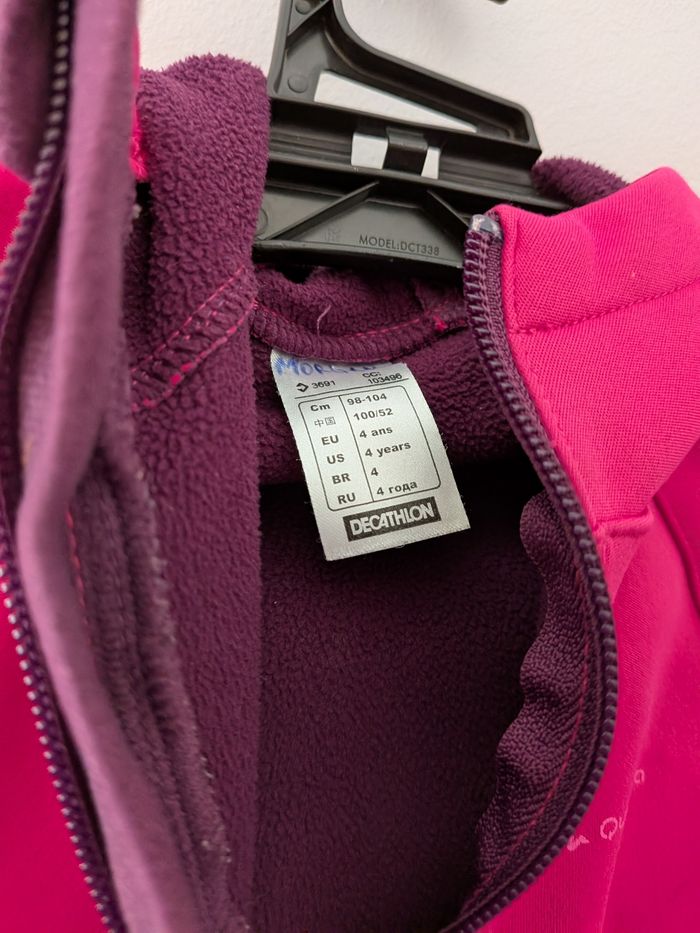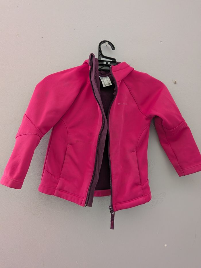Vends veste technique de randonnée (softshell) de la marque Quechua (Decathlon). Parfaite pour protéger du vent et d'une pluie légère tout en restant au chaud grâce à sa doublure polaire. Marque : Quechua (Decathlon) Taille : 4 ans / 98-104 cm Couleur : Rose fuchsia avec intérieur violet prune Matière : Extérieur résistant et doublure intérieure en polaire pour plus de chaleur État : Bon état général. À noter : quelques légères traces d'usage normales pour un vêtement enfant (voir photos 1 et 4). Détails : Capuche intégrée, fermeture éclair fonctionnelle et poches latérales. Idéale pour l'école, les balades ou les activités en extérieur par temps frais. Lavage effectué. Maison sans tabac. ("Prénom inscrit sur l'étiquette intérieure"). Envoi rapide via Mondial Relay, Relais Colis ou Shop2Shop. Réductions actives sur lot dès 50%