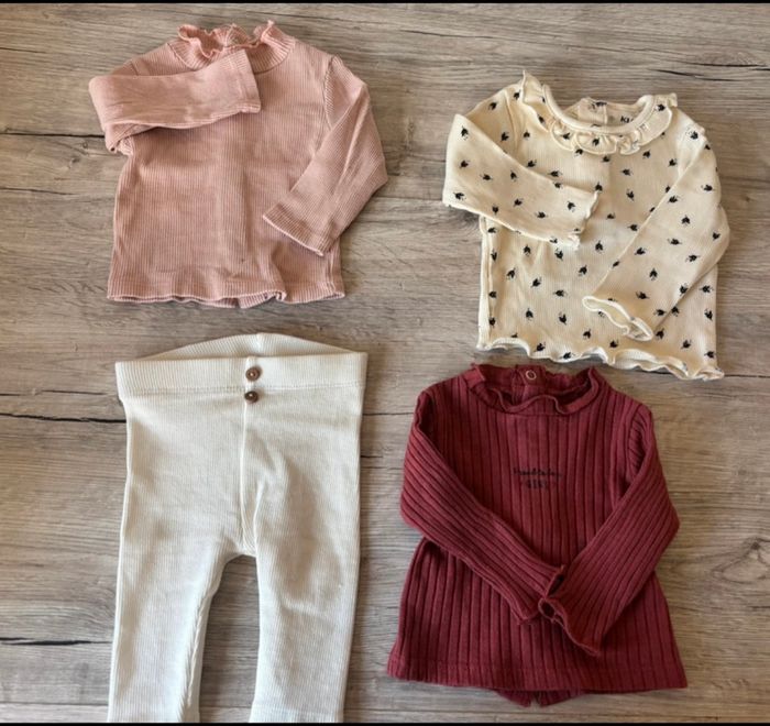 Lot ensemble avec : 1 legging blanc côtelé 3 hauts à manches longues côtelés En taille 1 mois et en très bon état