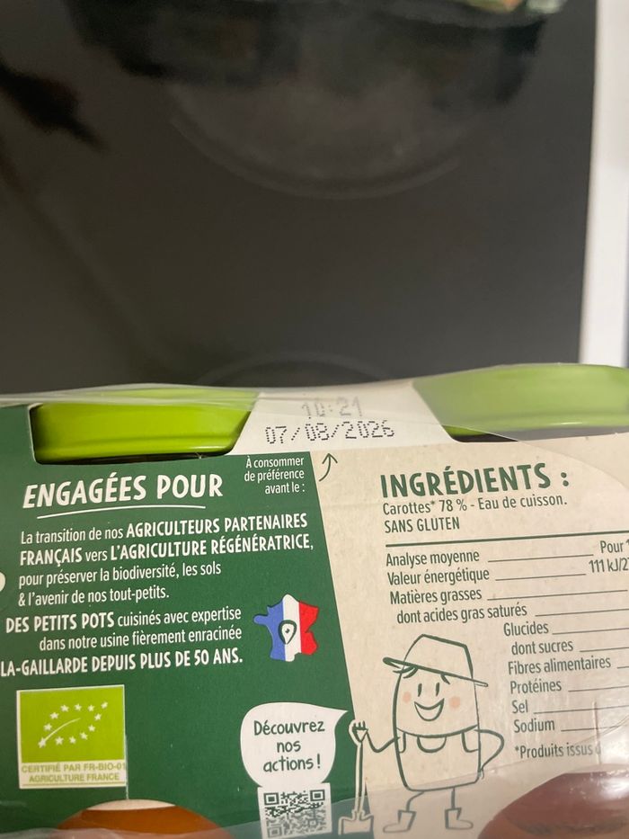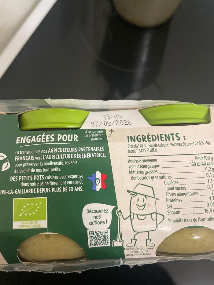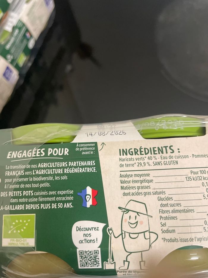 Ce lot de petits pots pour bébé dès 4/6 mois contient 18 pack de 2 petits pots chacun. 6 packs haricots verts pomme de terre 14/08/2026, 6 packs de carottes 7/08/2026 et 6 packs de brocolis pomme de terre 07/08/2026. Poids du colis 4kg680