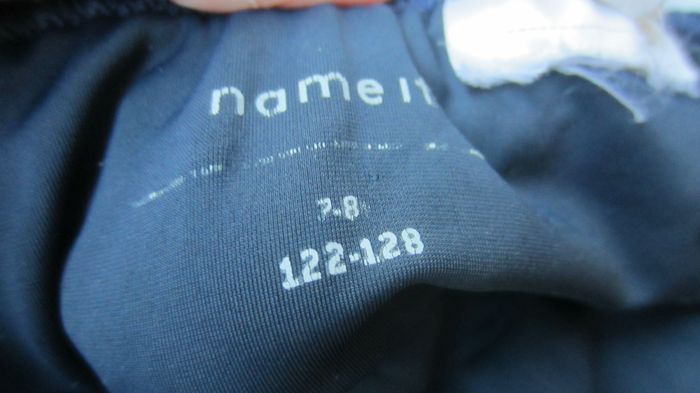 Maillot de bain 1 piece. Le tour de cou peut se resserrer. Caoutchoutée a la hauteur du dessous de poitrine. Petit volant et bande blanche et 1 brillante.Taille 7/8 ans. Marque Name it. Bleu marine.