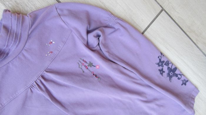 Tee shirt de coloris lilas/violet. Petit col. Dessins aux bras. Taille 10 ans. La compagnie des petits.
