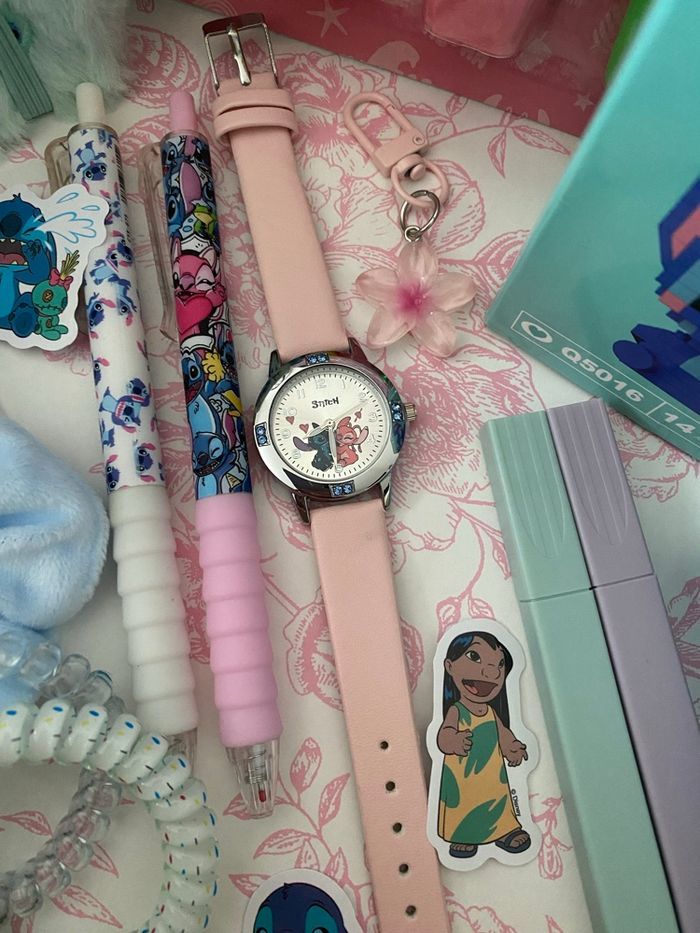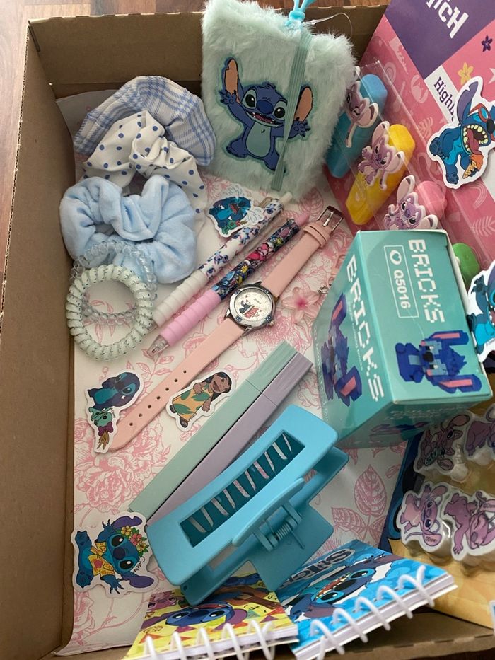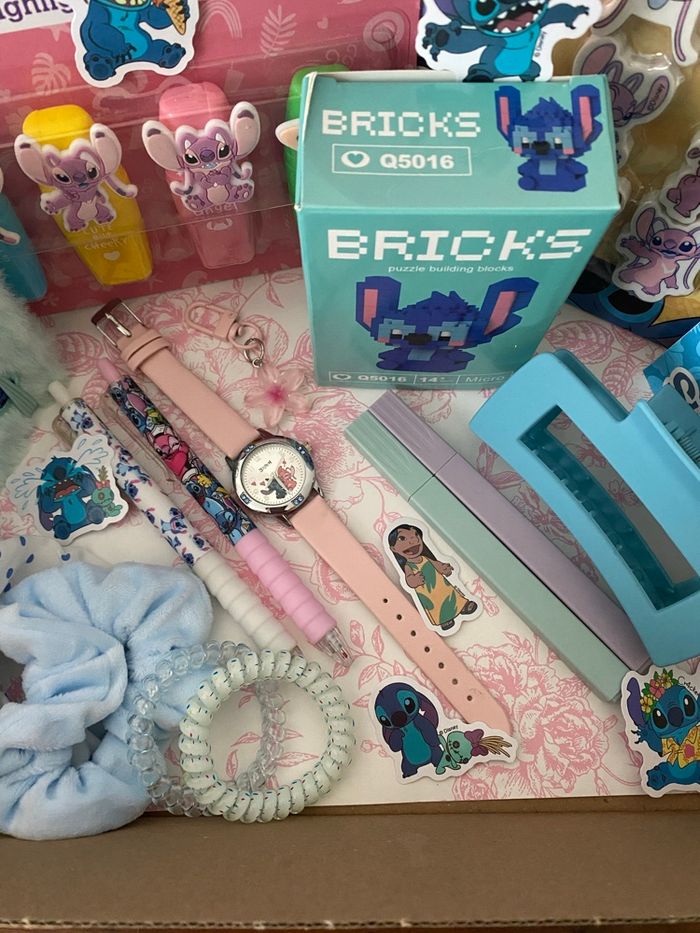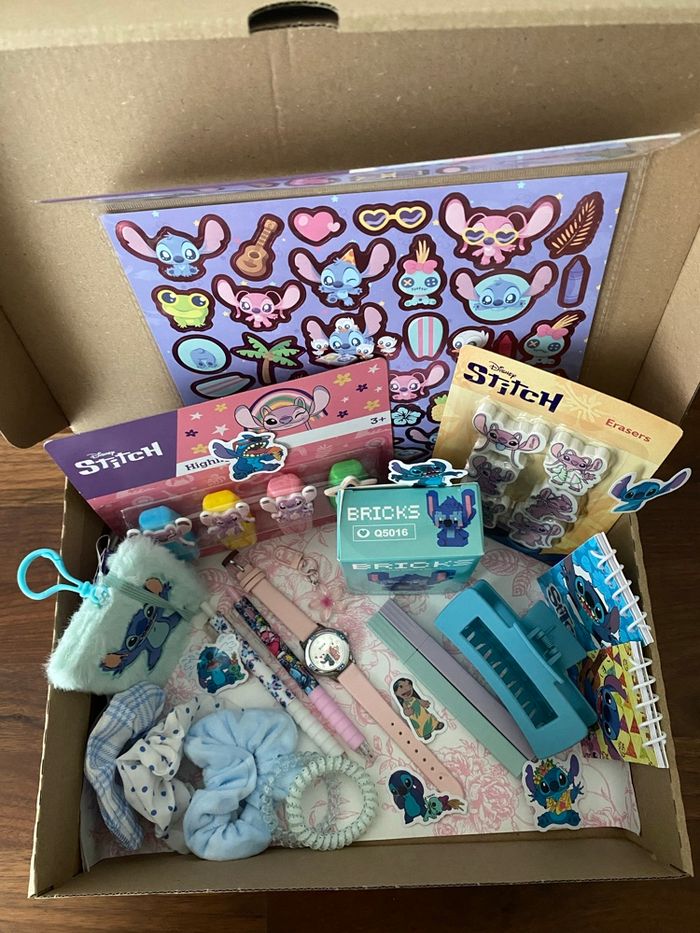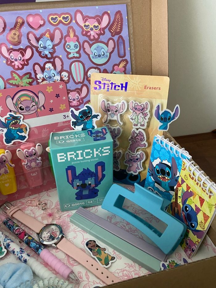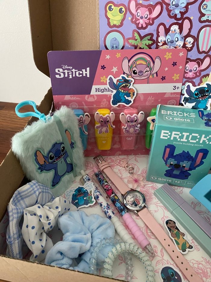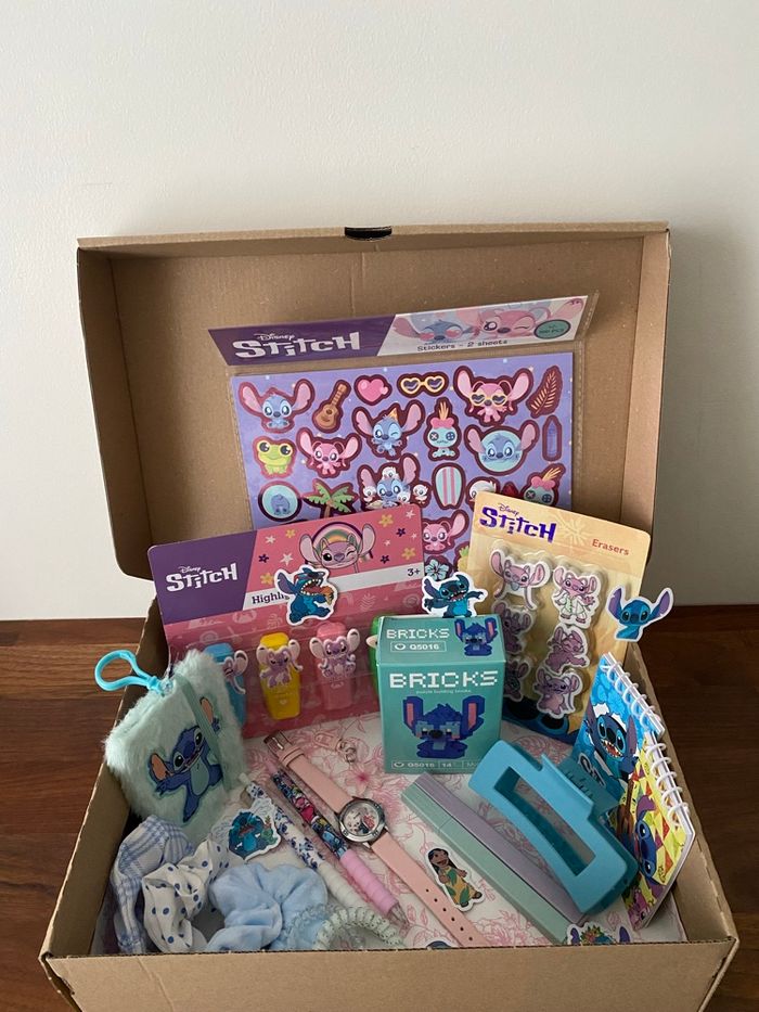Box cadeaux sur le thème de Stitch et Angel, prête à offrir. La box comprend : - une montre - planches de stickers - lot de surligneurs - lot de gommes - un mini carnet peluche - stitch à construire en mini bricks - mini bloc notes - 2 stylos - 2 surligneurs pastel - accessoires cheveux ( chouchous, pince ) - 1 porte-clés fleur Articles neufs. #stitch #boxcadeauxprêtesàoffrir #scoop
