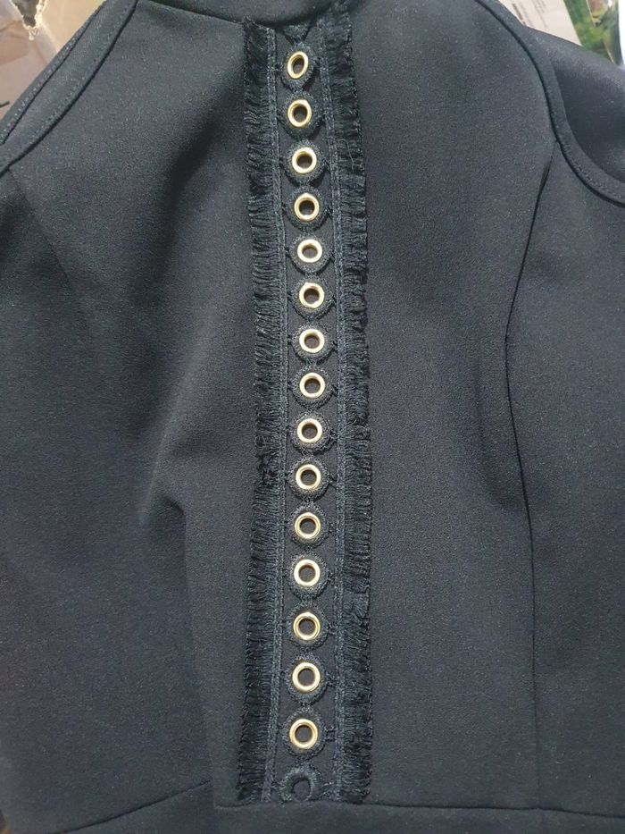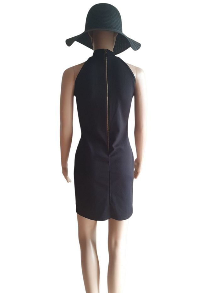 Craquez pour cette "Little Black Dress" à la fois chic et moderne, une pièce indispensable pour vos soirées ou événements habillés.  Sa coupe ajustée mettra parfaitement votre silhouette en valeur  🖤 Col montant & Coupe Licou : Un design sophistiqué qui dégage les épaules avec élégance  💛 Détails Raffinés: Un plastron central orné d'œillets dorés et de délicates finitions effet "franges" pour une touche de texture unique.   🧡 Fermeture éclair apparente: Un grand zip doré au dos qui apporte une note moderne et facilite l'habillage.  💜 Matière Confortable : Un tissu avec 5% d'elasthanne pour un ajustement près du corps tout en restant souple.  📏 Taille : 36. (Indiqué TU sur l'étiquette mais correspond à un S) Longeur : 76cm Composition : 95% Polyester,  5% Elasthanne  🌟 Très bon état  💡 Suggestion Mode: À porter avec des talons dorés pour rappeler les détails de la robe et une pochette assortie !
