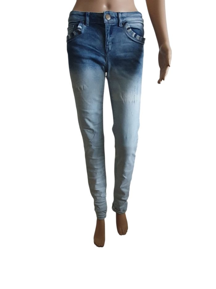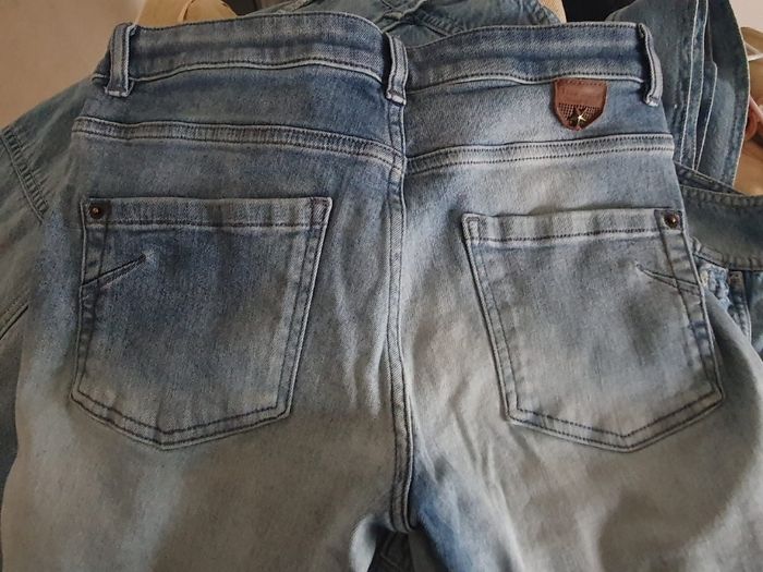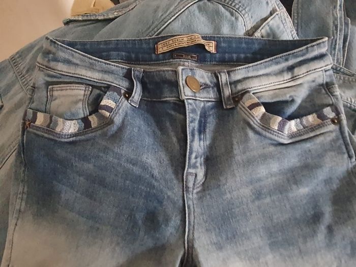 Ce jean Ikks n'est pas un basique ordinaire.  C'est une pièce forte qui combine le savoir-faire de la marque avec des détails travaillés qui font toute la différence.  💙 Un magnifique dégradé de bleu (Indigo vers bleu glacier) qui allonge visuellement la jambe. 🩷 Les entrées de poches avant sont ornées d'un galon tissé texturé (esprit ethnique/chic) dans des tons bleu marine, ciel, blanc, rehaussé de petits rivets métalliques cuivrés.  🤍 Légers effets de griffures placés stratégiquement pour un aspect authentique.  💜 Poche ticket discrète sur le côté droit  💚 Écusson IKKS en cuir embossé avec une petite étoile métallique sur la ceinture arrière.  📏 Pour vous assurez qu'il vous ira parfaitement,  fiez vous à la grande sagesse de "Maître Ruban" ⤵️ Taille : 36cm Longeur : 106cm Entrejambe : 85cm 💰 Prix boutique : 145€ 🌟 Très bon état