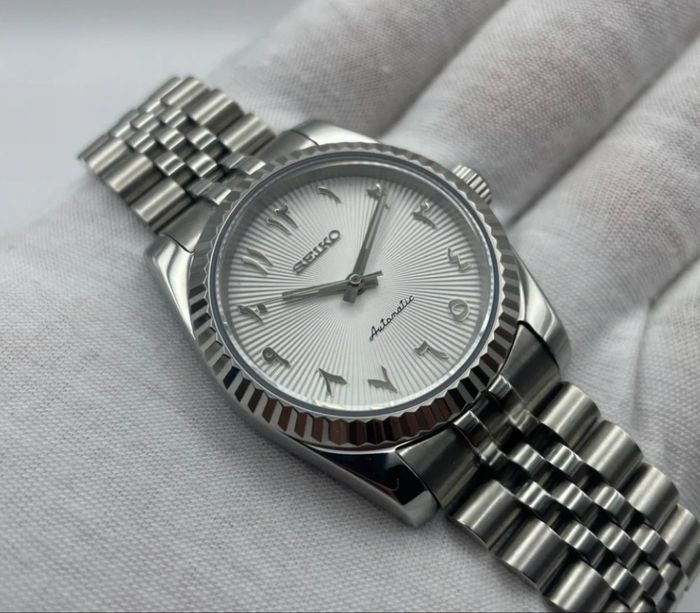 Seiko mod blanc arabic dial - Épaisseur : 12mm - Étanchéité : 3 ATM - couleur rose / mécanisme apparent; ouvert - Boîtier : Acier inoxydable - Fond de boîtier: Transparent - Bracelet: Acier inoxydable - Couronne : Acier inoxydable; vissée - Verre : Saphir - Mouvement: Automatique Nh35 : -48 heures de réserve de marche en pleine charge ! cette montre est assemblée/modifiée avec des composants compatible Seiko mais n'est en aucun cas rattachée à l'image de la marque !