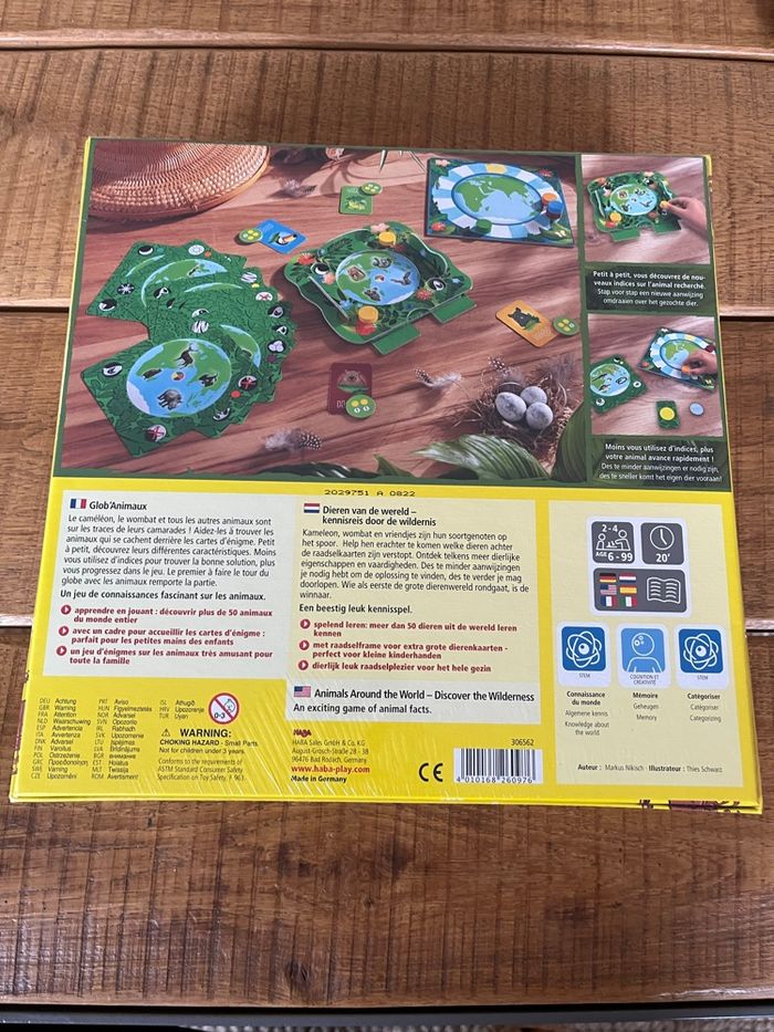Neuf Sous blister Découvrez plus de 50 animaux du monde entier ! Partez à la découverte de Glob'Animaux ! Les joueurs essaient de trouver quels animaux se cachent derrière les cartes d'énigme. Petit à petit, ils découvrent leurs différentes caractéristiques (ex: plumes ou pelage, carnivore ou herbivore, etc). Moins ils utilisent d'indices pour trouver la bonne solution, plus ils progressent dans le jeu. Le premier à faire le tour du globe avec les animaux remporte la partie.