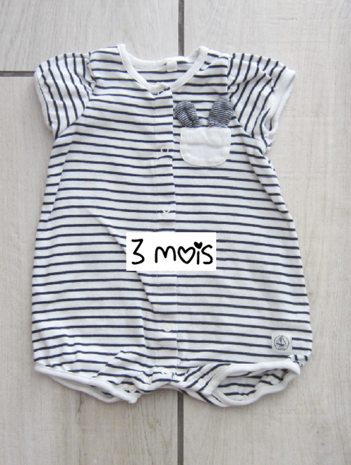 Combishort de la marque Petit Bateau. S'ouvre entierement sur le devant. Taille 3 mois. Tres peu porté.