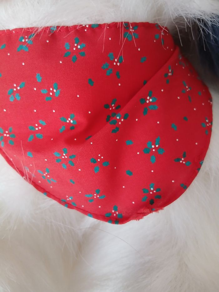 Doudou-Peluche entièrement rembourré; yeux en plastique; museau en plastique recouvert de tissu velouté; pince fantaisie amovible; ruban autour du cou non amovible; bandana amovible en tissu imprimé. Pelage gris, blanc, et blanc teinté de gris. Hauteur totale de 27 cm; longueur maxi [ inclus la queue] de 36 cm. Lavable à 30° // voir photos pour détails