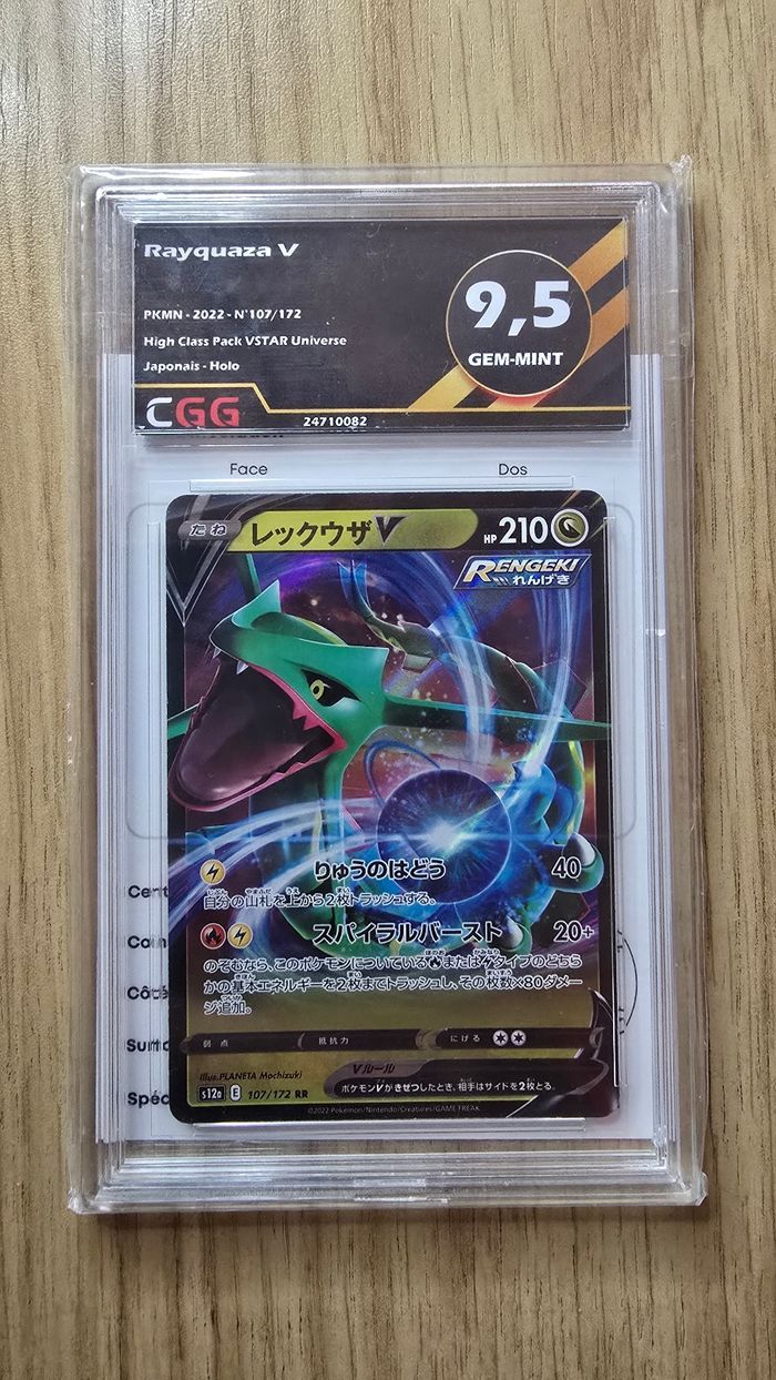 Carte Pokémon japonaise officielle Rayquaza V – 107/172 Année : 2022 Grade : 9.5 – CGG Carte très appréciée des collectionneurs. État excellent, slab scellé. 📦 Envoi rapide et sécurisé 📮 Livraison suivie